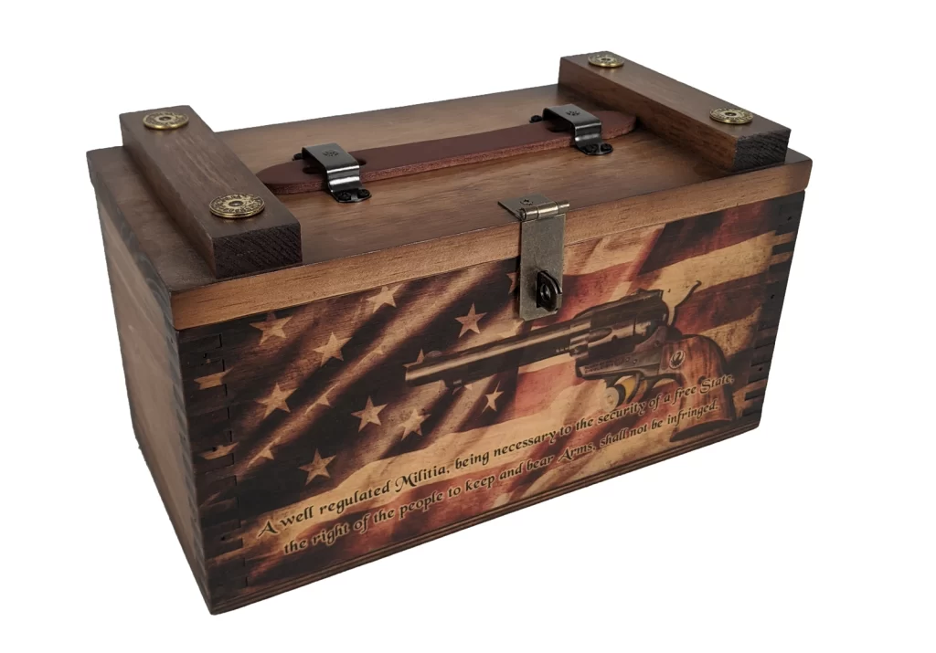 Our latest creation is the 2nd Amendment Shooter’s Box. Features a pistol with the American flag background and 2nd amendment wording. Inspired by those who have a deep love for our country and constitutional rights. Handmade in the USA.