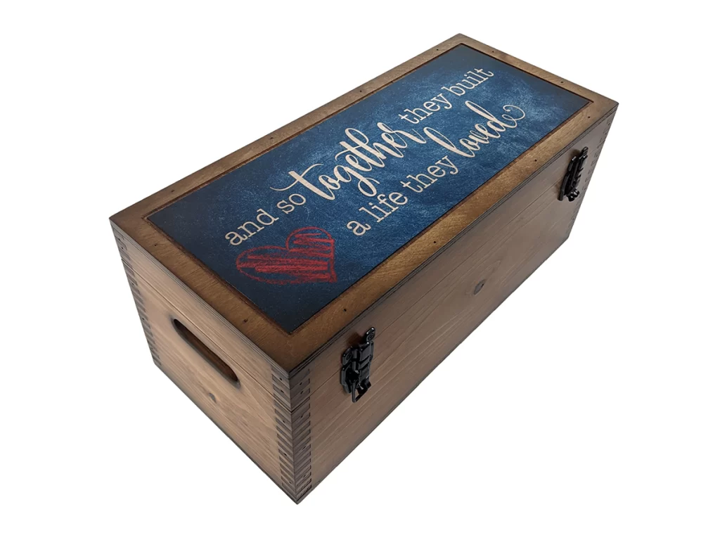“And so together, they built a life they loved”. A Life They Loved Storage Box is the perfect anniversary or wedding gift to hold special mementos from your relationship. There’s plenty of room for Ticket stubs, photographs, souvenirs, a veil, or anything else you wish to keep inside.