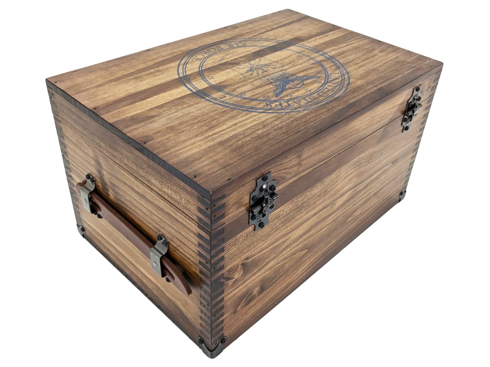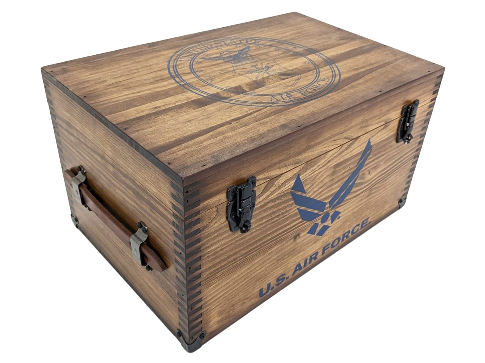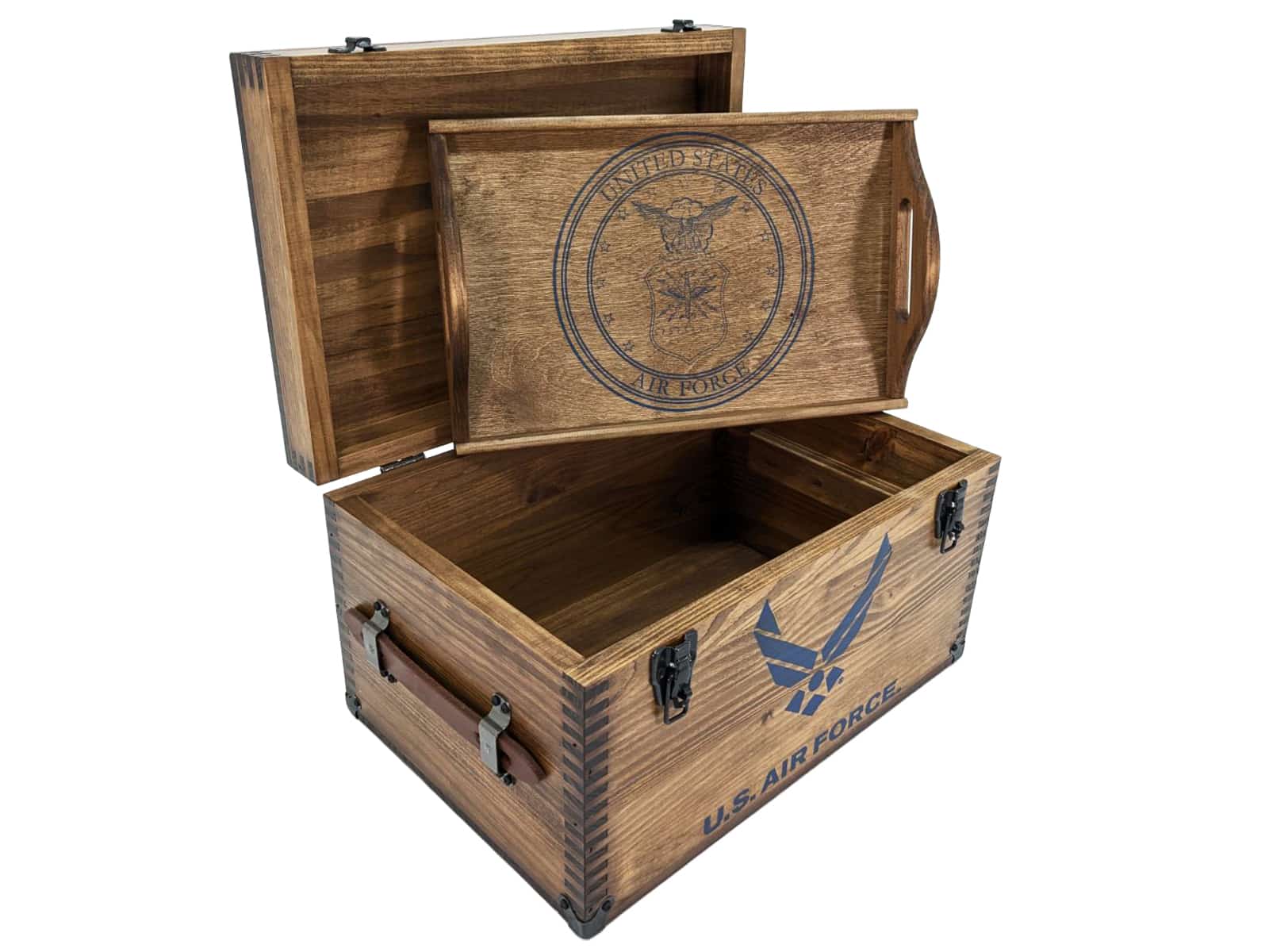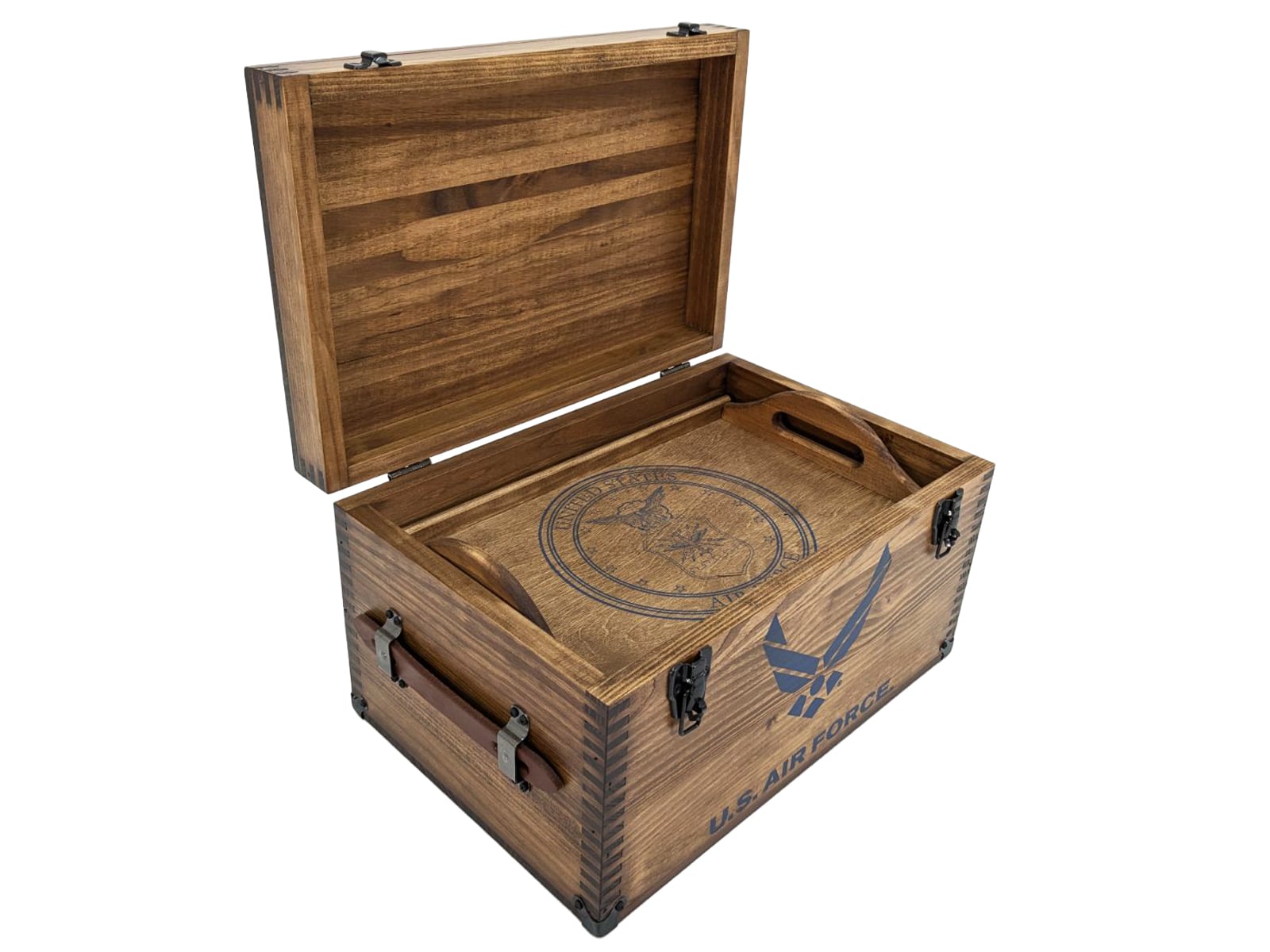 Includes: US Air Force Seal Embossed Lid Top •  US Air Force Front Text •  US Air Force Seal Embossed Tray • Leather Handles
