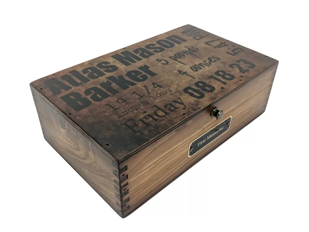 Personalize the top with your baby’s name, birth date, weight, and length, displayed in a bold grunge-style design that blends contemporary flair with heartfelt sentiment. Inside, there’s room to store special keepsakes — from hospital bracelets and baby shoes to photos and handwritten notes. It’s a beautiful balance of style and meaning that turns everyday memories into timeless treasures.