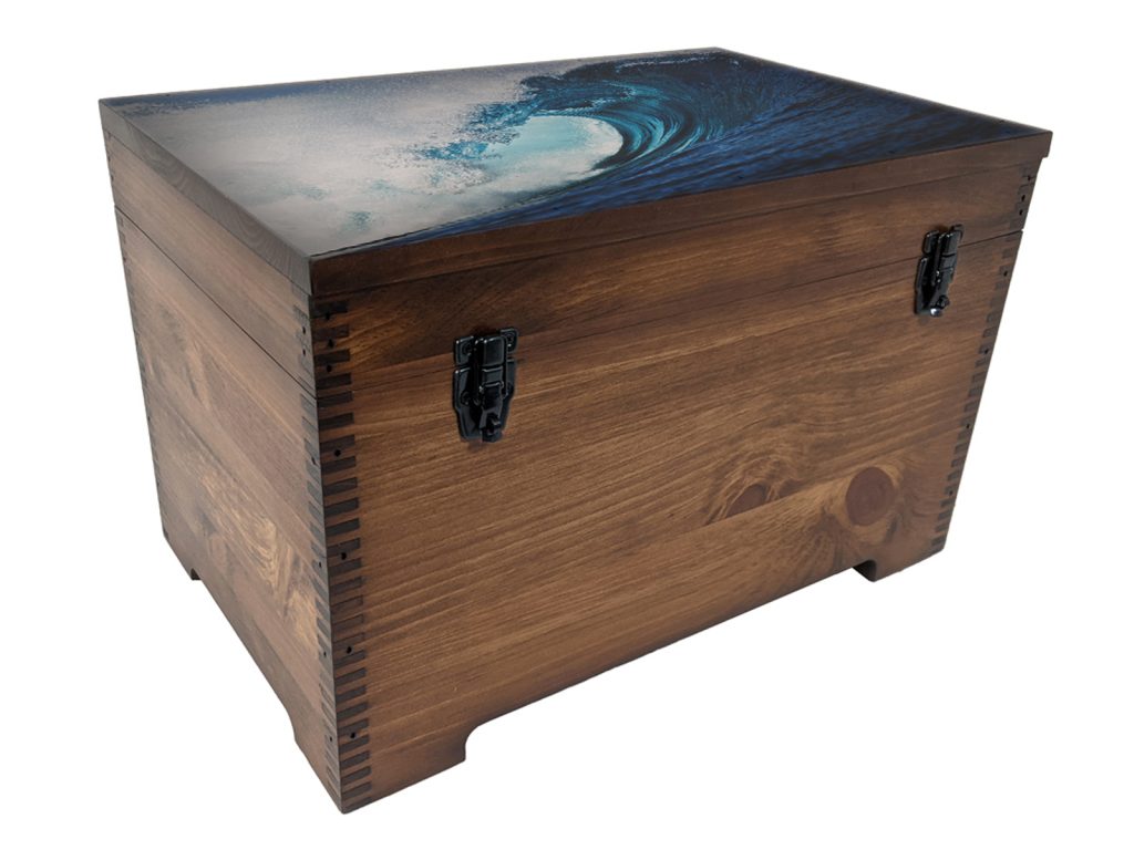 The Blue Ocean Wave Mini Trunk artwork features a full curl blue ocean wave! For those who love the ocean, it’s waves, and it’s salty kiss, this makes a wonderful conversation piece in your home or office. A plain tray to hold all of your trinkets completes this beautiful Blue Ocean Wave Keepsake Box.