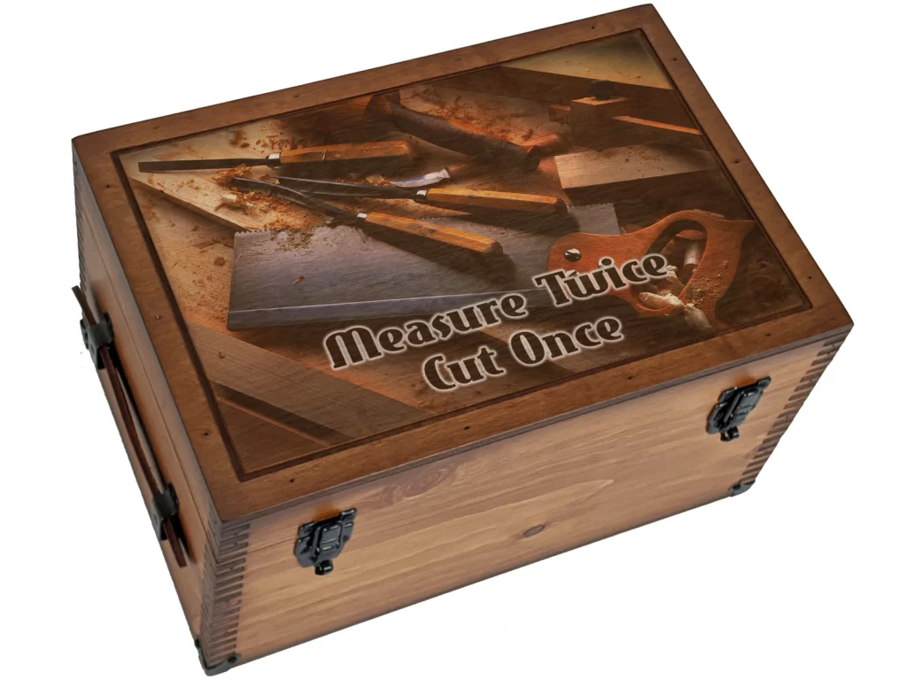 Carpentry Woodworking Tools Keepsake box is the perfect gift for any carpenter or woodworker. Features woodworking tools with “Measure Twice, Cut Once”.