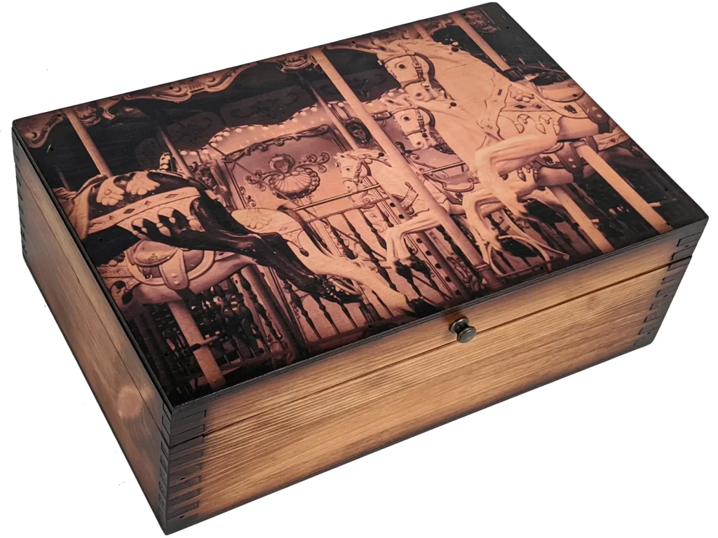 Beautiful antiqued artwork is embedded into the wood then lacquered over top to ensure it resists damage from scratches. We believe our carousel wooden memory box is a testament to America’s great history of producing quality products that are meant to last . . . and that is how we still do it today!