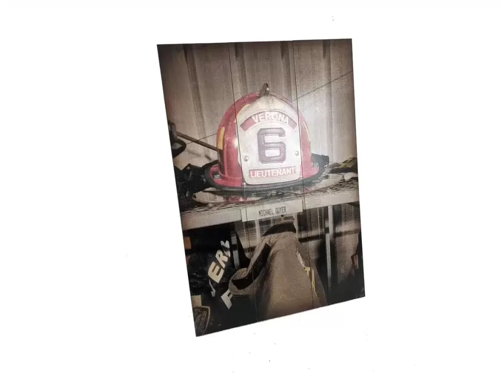 This pallet sign is designed for environments like fire station foyers, chief officer offices, department briefing rooms—or even a prominent spot at home. At 24″ × 35″, it provides meaningful scale and presence without dominating the space. Personalization starts with full-color embedded artwork and can be expanded with optional upgrades such as laser-engraved text (name, station number, years of service), custom mounting hardware for wall or shelf display, and finish enhancements tailored to interior décor.