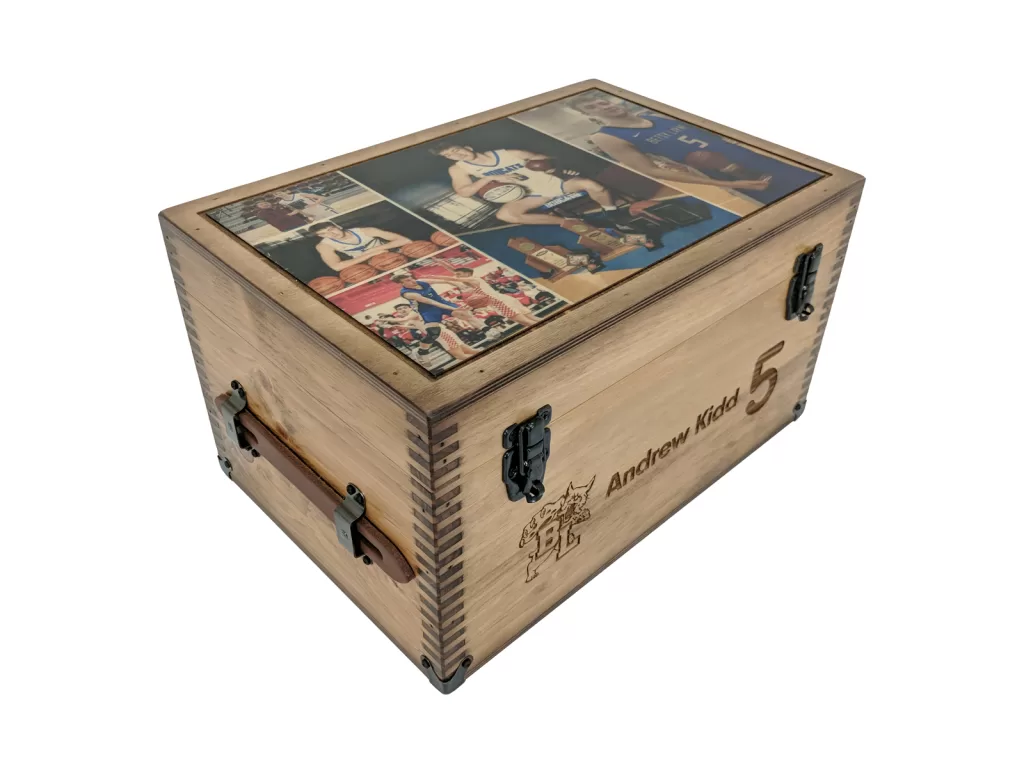 One of a kind and handmade in America. The Custom Basketball Keepsake box makes an incredible gift for basketball players, coaches, and teams. Put your custom basketball player action photo along with their name and number as well as the school name and year they played. Our custom basketball gifts are handcrafted in the USA and are made one at a time just for you.  These unique basketball gifts make a truly thoughtful gift for the Basketball MVP or Coach to keep the year’s newspaper clippings, game programs, tickets, etc.