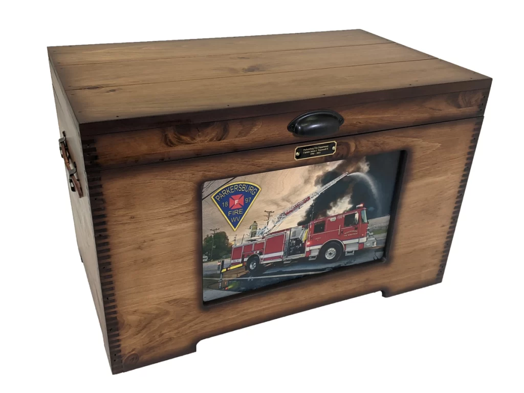 Make a statement with this custom wooden Firefighter Retirement Trunk. Comes standard with your Firefighter Patch  or custom artwork on the front.