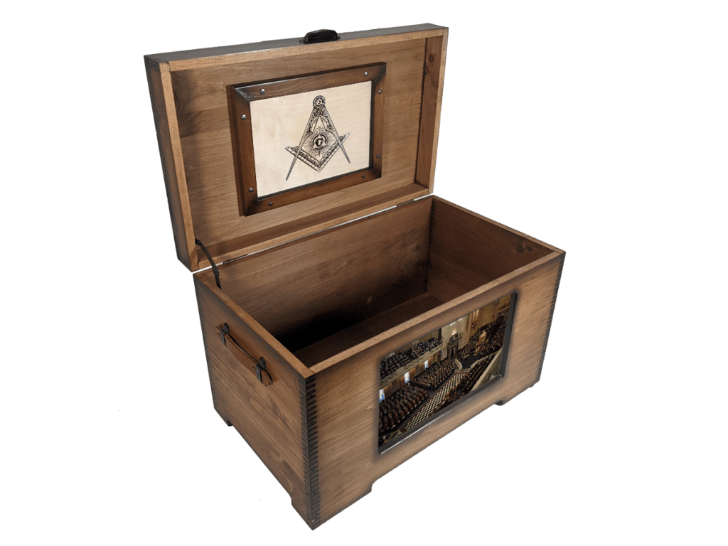 Personalize our beautiful hand made in America Custom Wooden Freemason Trunk. You can put your custom artwork on the front (included in price) and then personalize it even further. We offer the ability to add either, custom artwork on the outside lid top, inside lid that is framed and accented with hammered brass nailheads, or a felt shadowbox which covers the entire inside lid. Additionally, you can add a full length or half length sliding tray and then add felt to the inside bottom of it. Felt colors include red, royal blue, navy blue, olive green, and black.