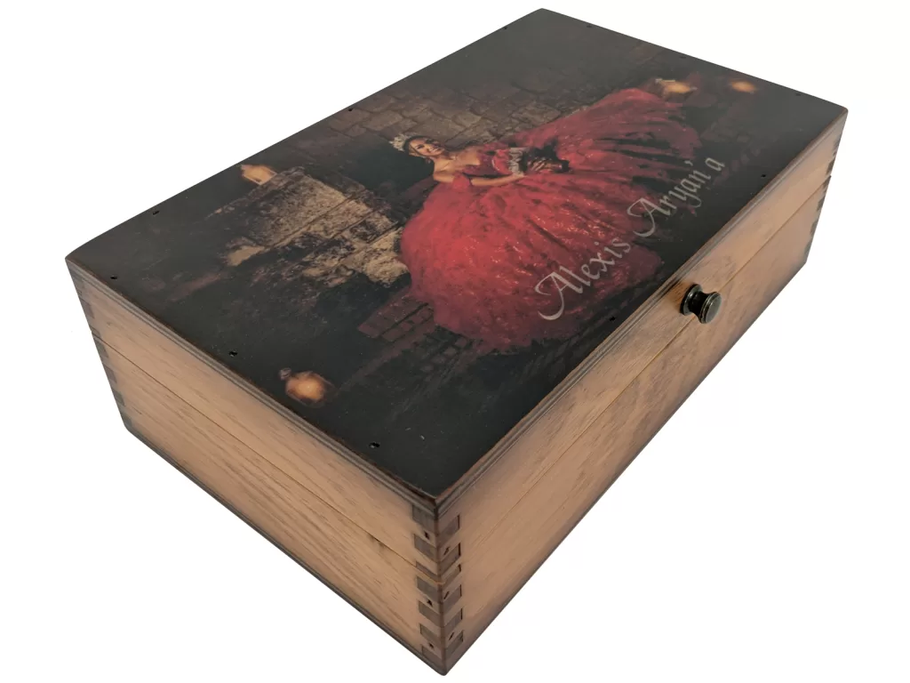 The box was beautiful. Words and pictures alone can not describe the beauty of it. We customized the top and the inside and it was so perfectly done. I will be recommending this to others and will probably order more for myself. The one we ordered was for our Boss’s retirement