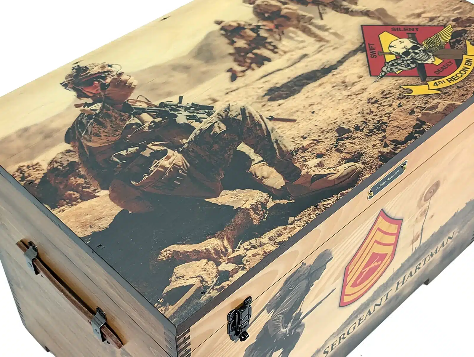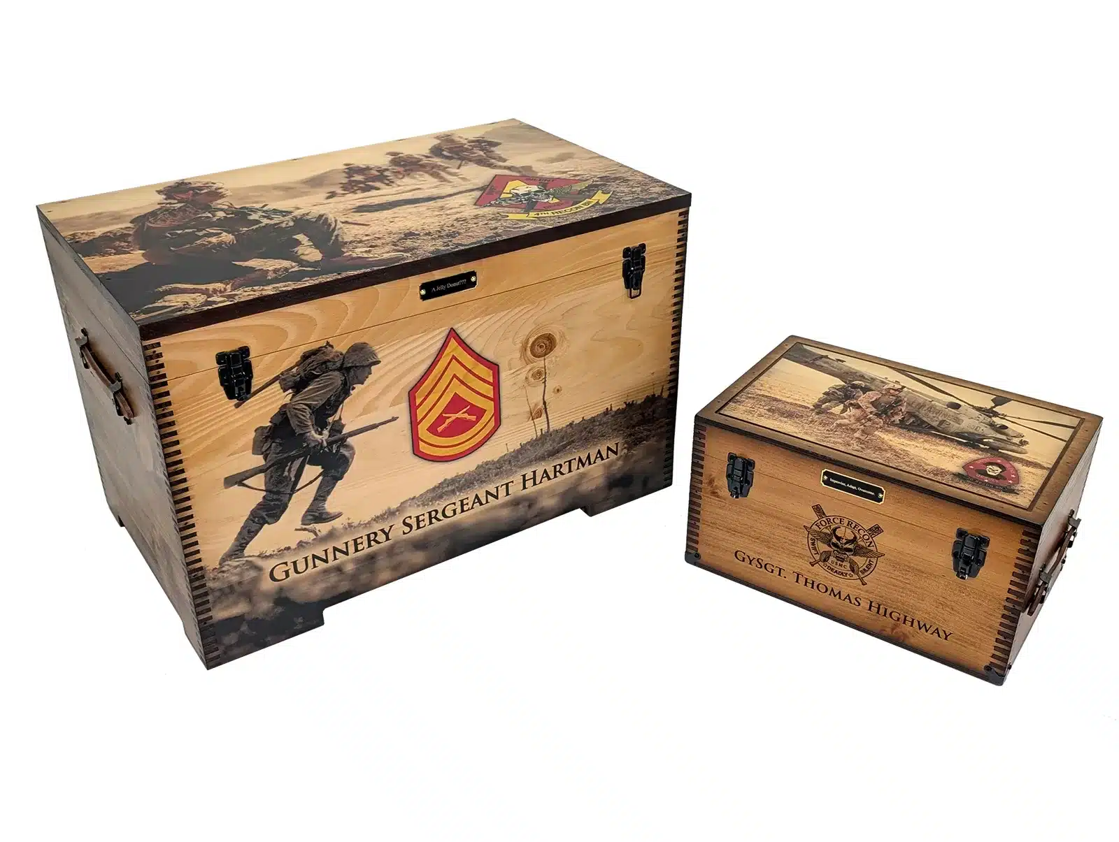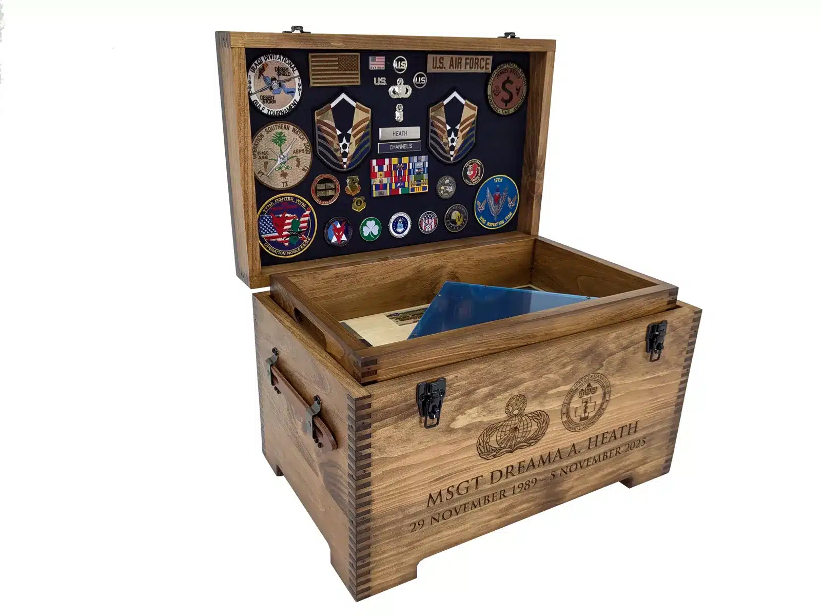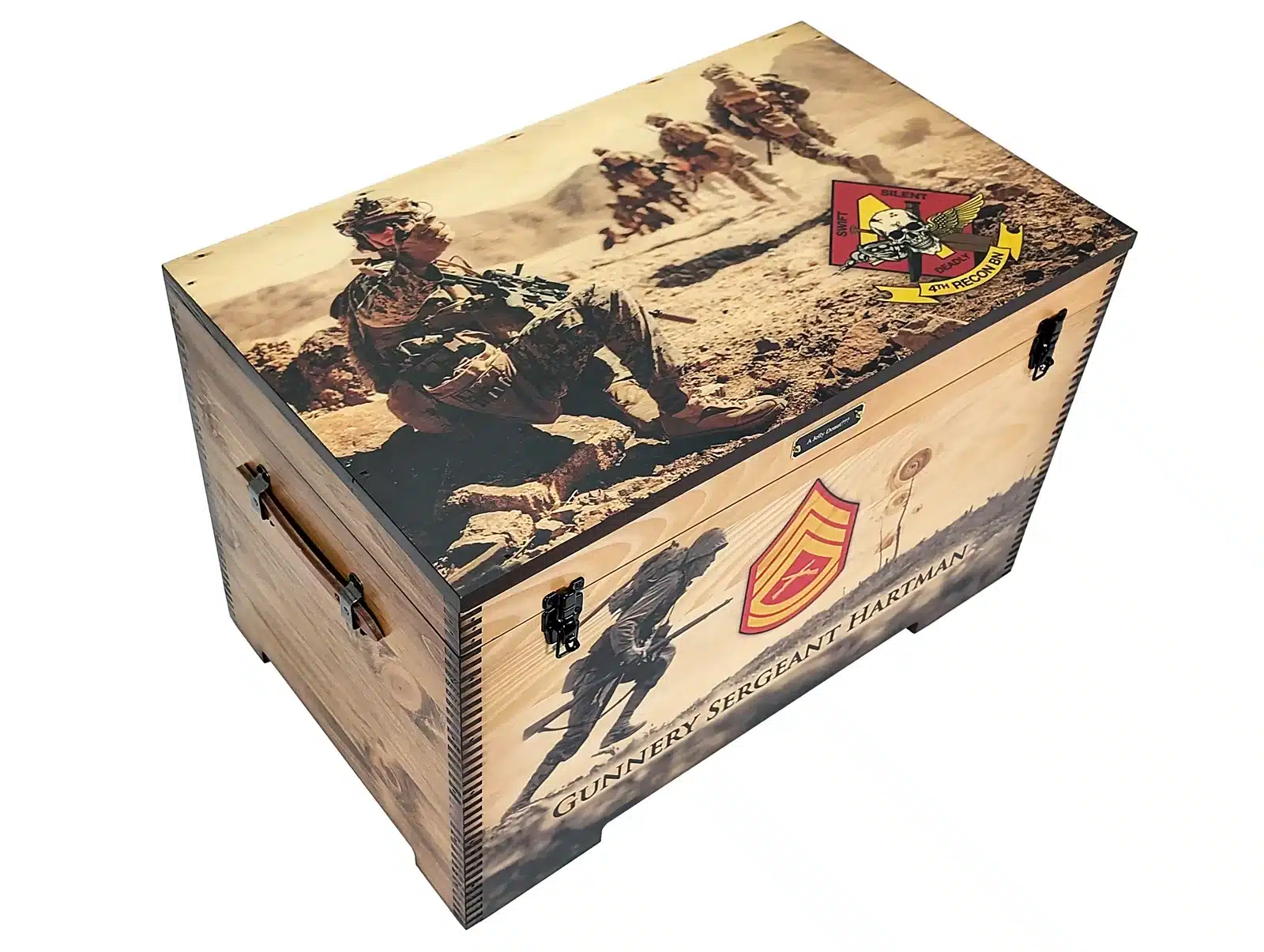 The Custom Military Keepsake Trunk from Relic Wood is designed to commemorate your service or the service of a loved one with distinction and personal flair. This robust keepsake trunk features full-size artwork on the lid and front panel and offers extensive personalization options including laser engraving, brass nameplates, felt-lined interiors, and optional sliding trays. The piece is built by a veteran-owned, family-run workshop in the USA, combining craftsmanship with meaningful detail to create a display-worthy tribute. Ideal for storing medals, patches, awards, or personal memorabilia, this military-themed trunk brings your story front and center. With its bold presence, secure hardware, and tailored artistry, this keepsake trunk stands as a refined, lasting testament to service, sacrifice, and legacy.
