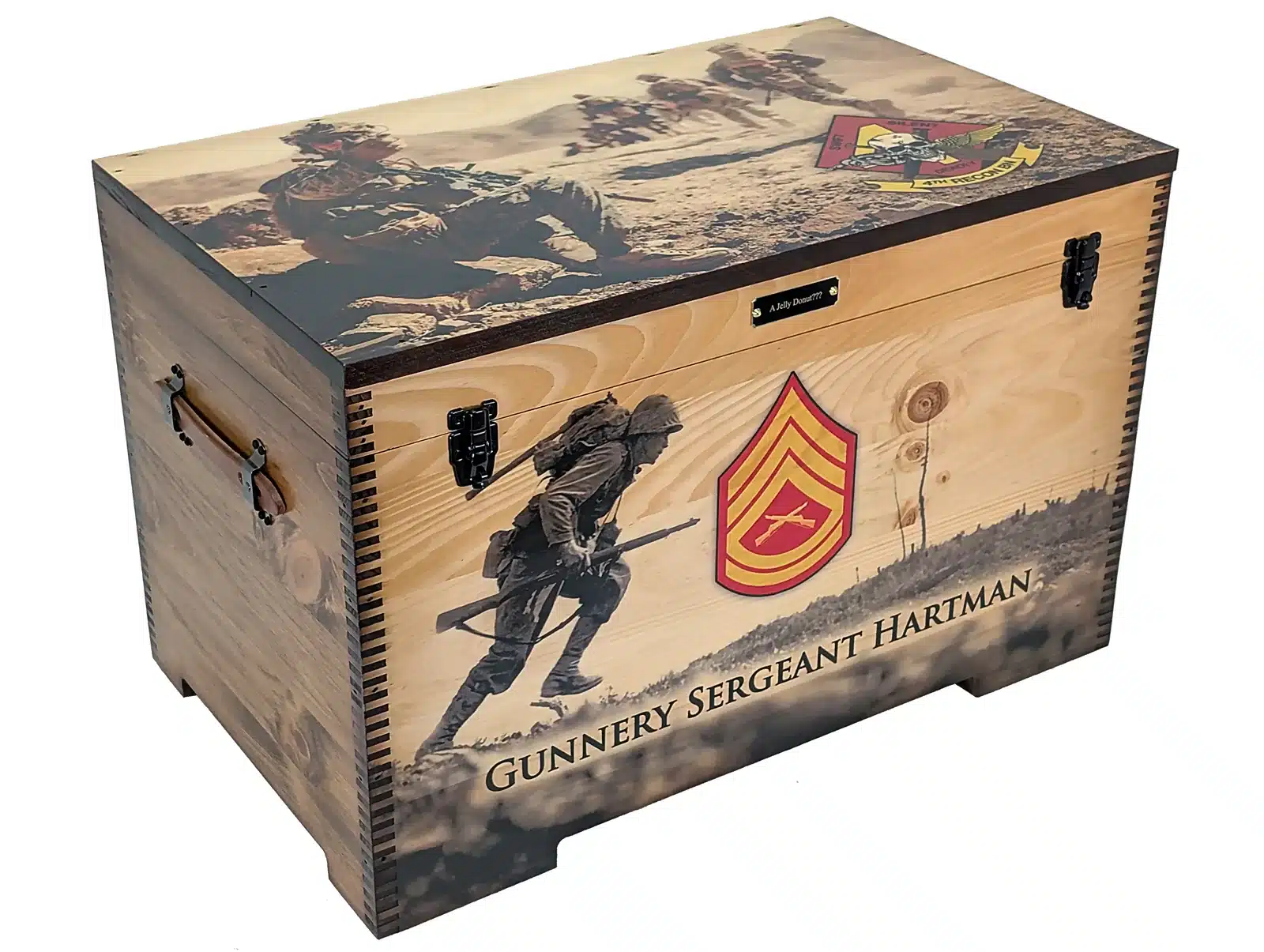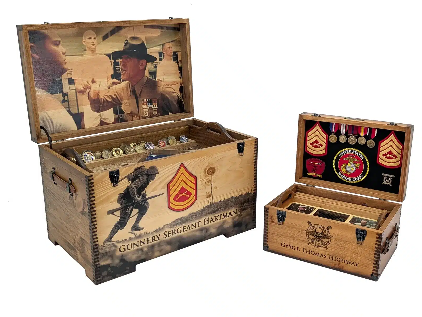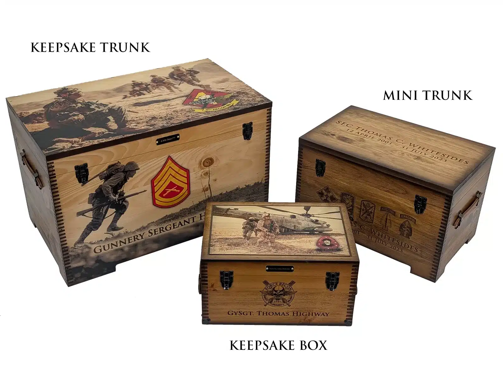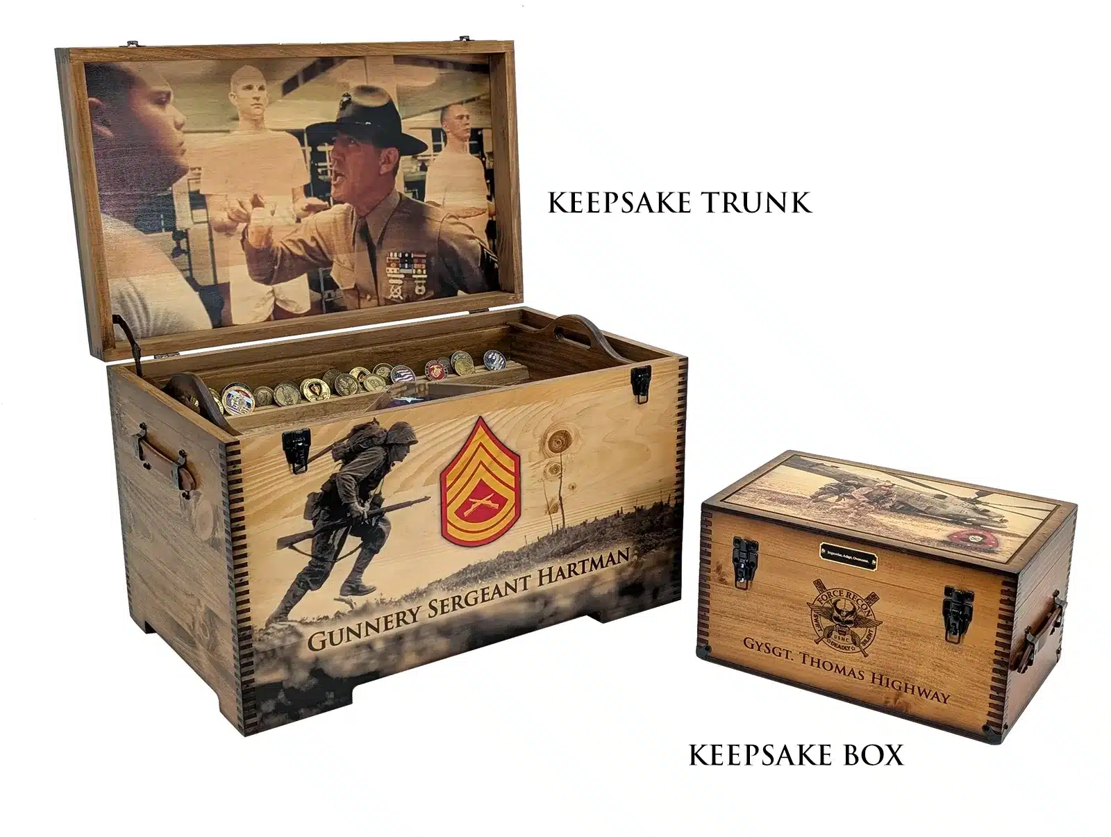 The Custom Military Keepsake Trunk from Relic Wood is designed to commemorate your service or the service of a loved one with distinction and personal flair. This robust keepsake trunk features full-size artwork on the lid and front panel and offers extensive personalization options including laser engraving, brass nameplates, felt-lined interiors, and optional sliding trays. The piece is built by a veteran-owned, family-run workshop in the USA, combining craftsmanship with meaningful detail to create a display-worthy tribute. Ideal for storing medals, patches, awards, or personal memorabilia, this military-themed trunk brings your story front and center. With its bold presence, secure hardware, and tailored artistry, this keepsake trunk stands as a refined, lasting testament to service, sacrifice, and legacy.