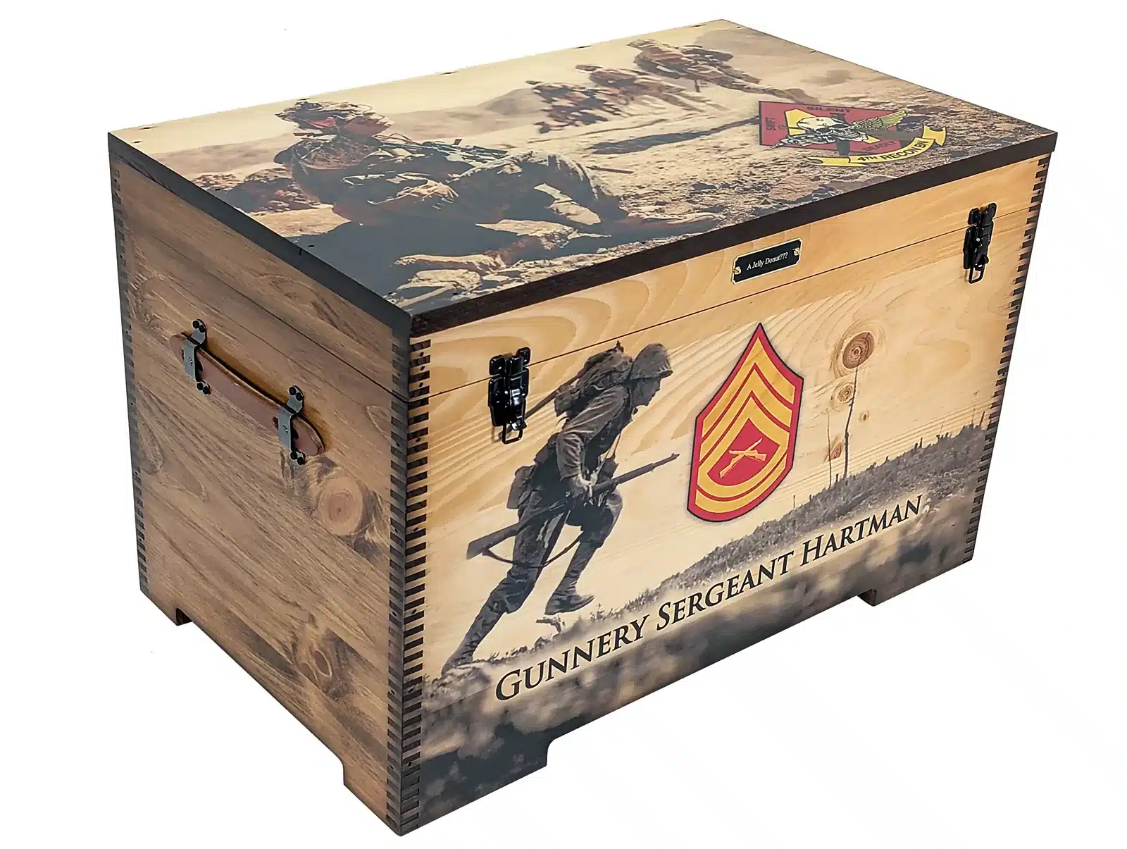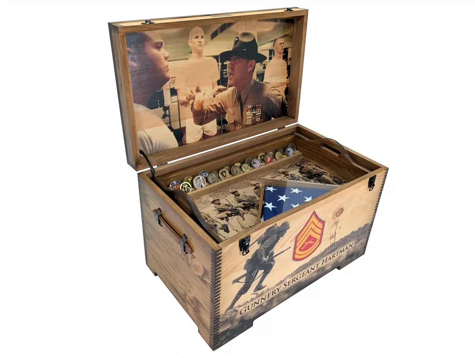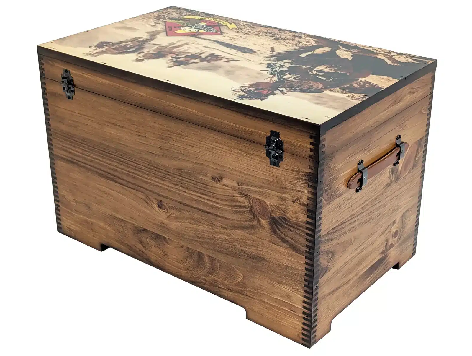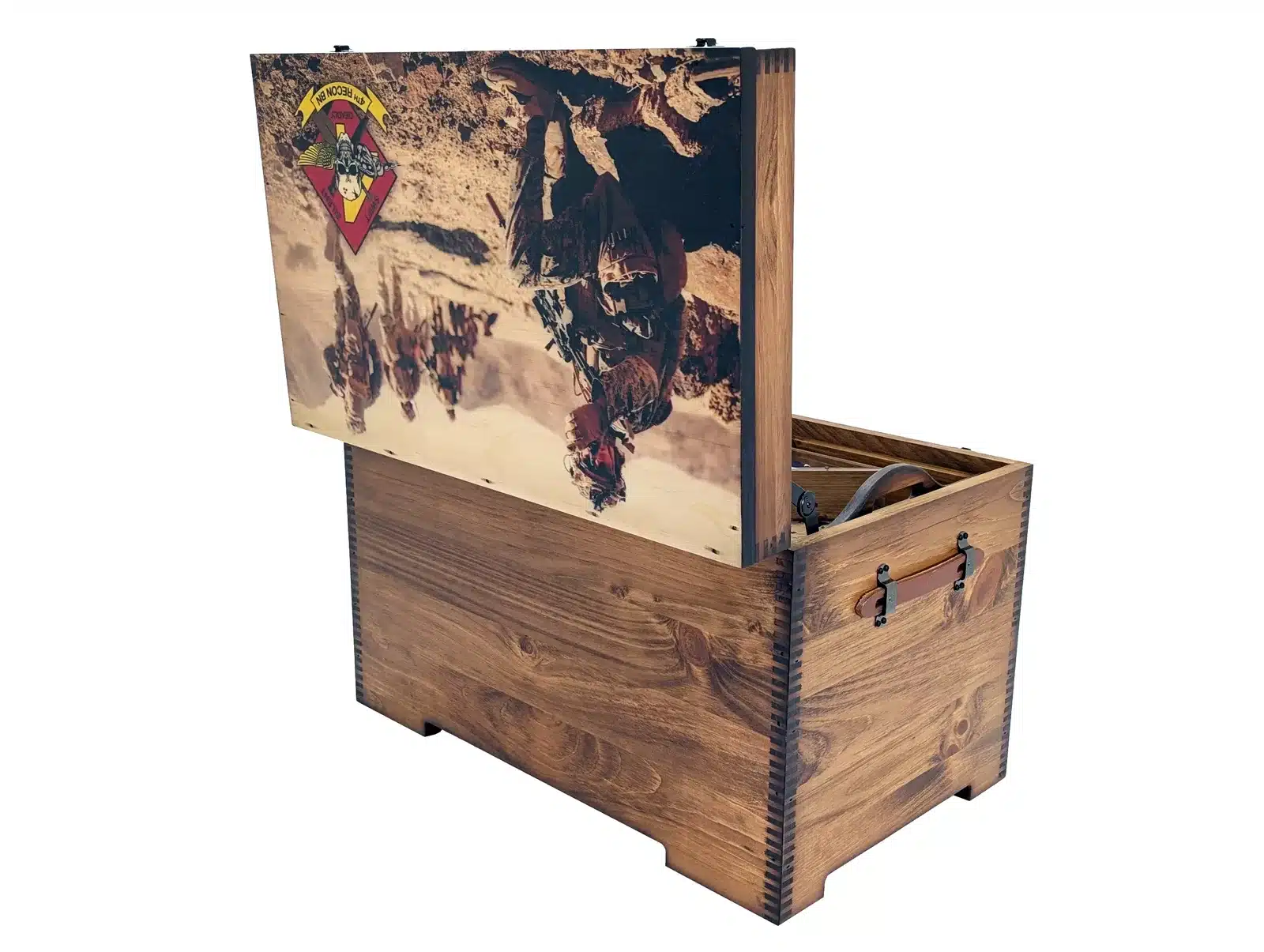 You have been asking for it, and we have delivered. We now have the ability to offer you FULL SIZE Color Artwork and Laser Engraving on the ENTIRE lid top, inside lid, and the outside front of our largest trunk we make.