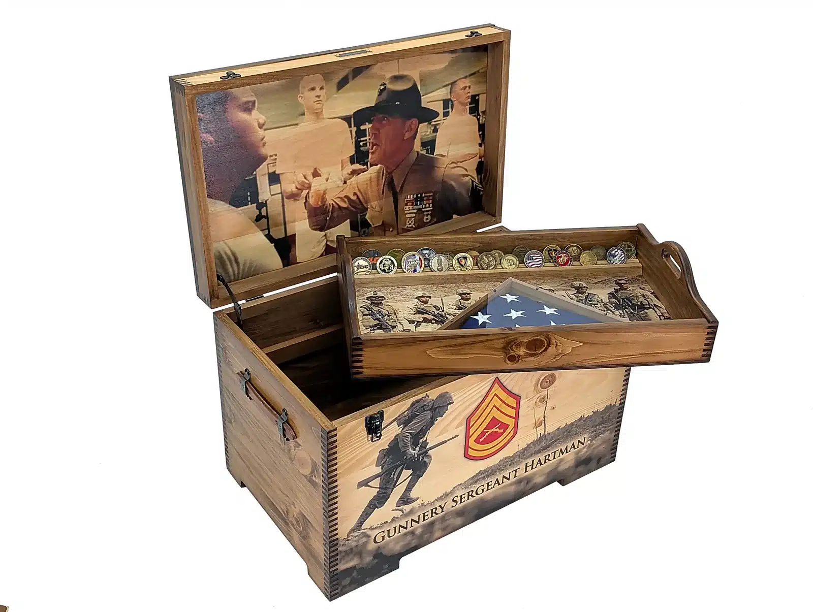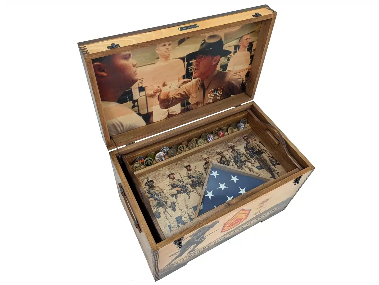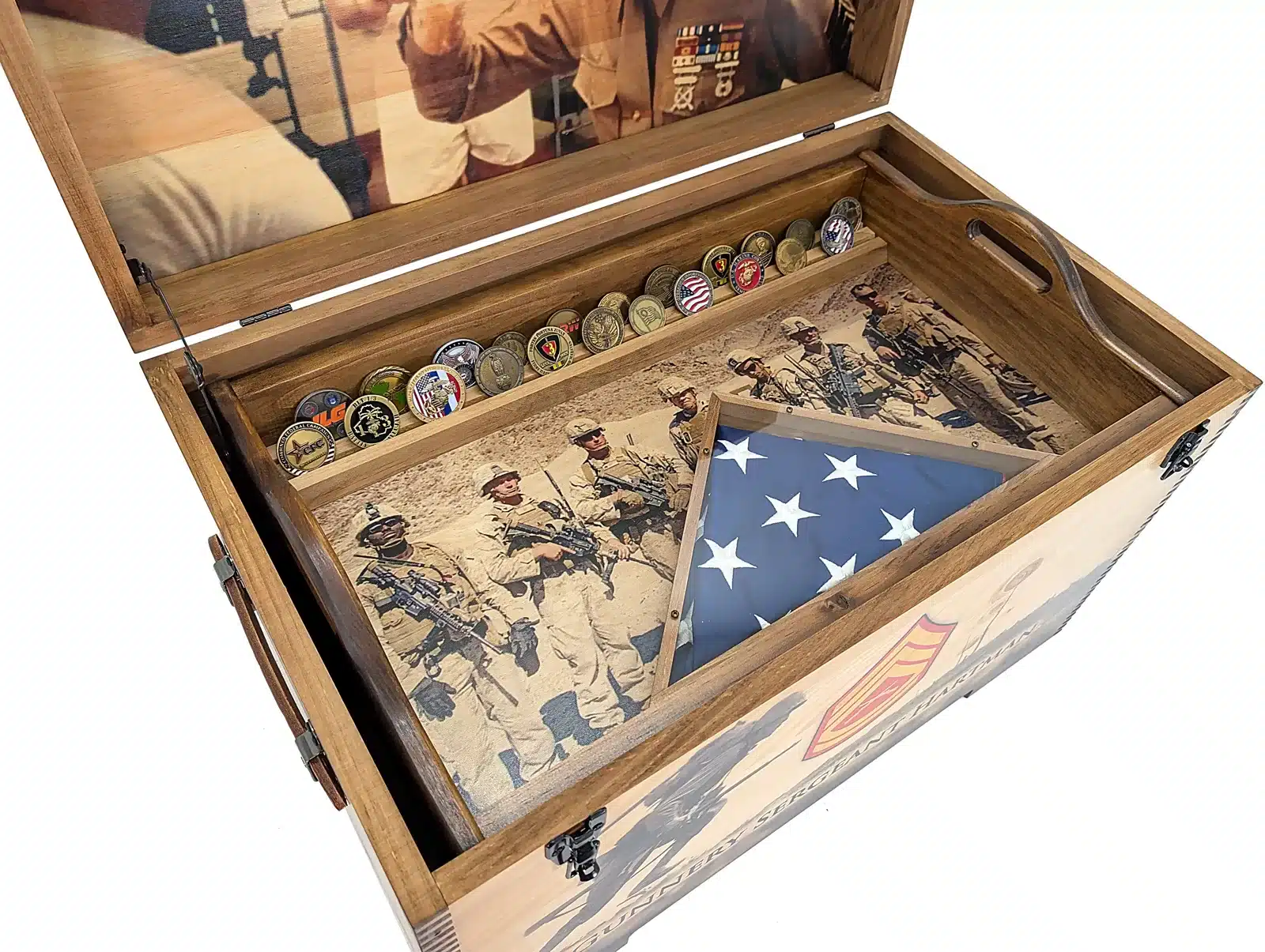 Personalize this beautiful hand made in America Custom Wooden Military Keepsake Trunk with a crazy amount of options. We offer the ability to add either, custom full size artwork on the front, outside lid, inside lid, or a felt shadowbox which covers the entire inside lid (this cannot be used in conjunction with artwork). Additionally, you can add a full length or half length sliding tray and then add felt to the inside bottom of it. Felt colors include burgundy, red, royal blue, navy blue, olive green, and black. Additional options include, brass nameplate, flag holder, coin holder, inside full tray or half tray, felt or artwork on the tray, and leather handles. So much to choose from!