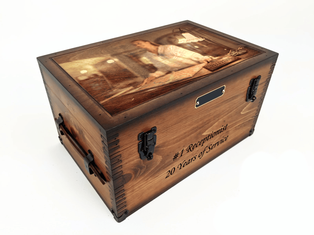 You’re in control of the design: feature your company logo, job title, profession-related icon or photo on the lid, then add laser-engraved text such as name, years of service or milestone date. Optional upgrades include a brass nameplate, felt-lined interior, shadow-box tray, or additional artwork locations inside the lid, under the removable tray or on the front panel. With exterior dimensions around 18″ L × 12″ W × 10″ H and interior space approximately 16¼″ L × 10½″ W × 7″ H, the box offers ample storage capacity while remaining attractive enough for display.