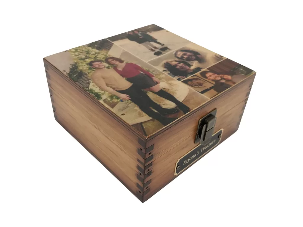 Begin with the lid—upload your favorite photo, a monogram, or a meaningful quote and let it set the tone. Personalization continues with options like laser-engraved text, a brass nameplate, felt-lined bottom or inside lid, and interior artwork placement. Choose colors, finishes, and layouts that match your personal style or décor.