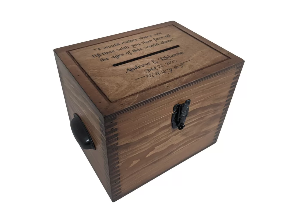 Accented with lockable metal hasp, decorative metal handles, sturdy metal hinges, routed lid top, and custom options to personalize this handcrafted wedding card box. Each one is custom made one at a time just for you.