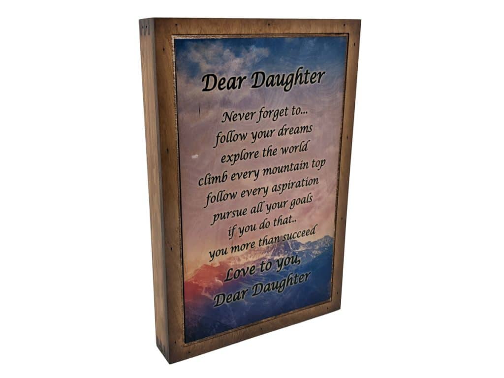 The Dear Daughter Wall Art is the perfect, inspiring and beautiful decoration for your daughter to add to her room. It will remind her every day you are her biggest supporter. This wall art will inspire her to follow her dreams no matter what. Additionally, the artwork includes a beautiful mountain scape and uplifting daughter quote.