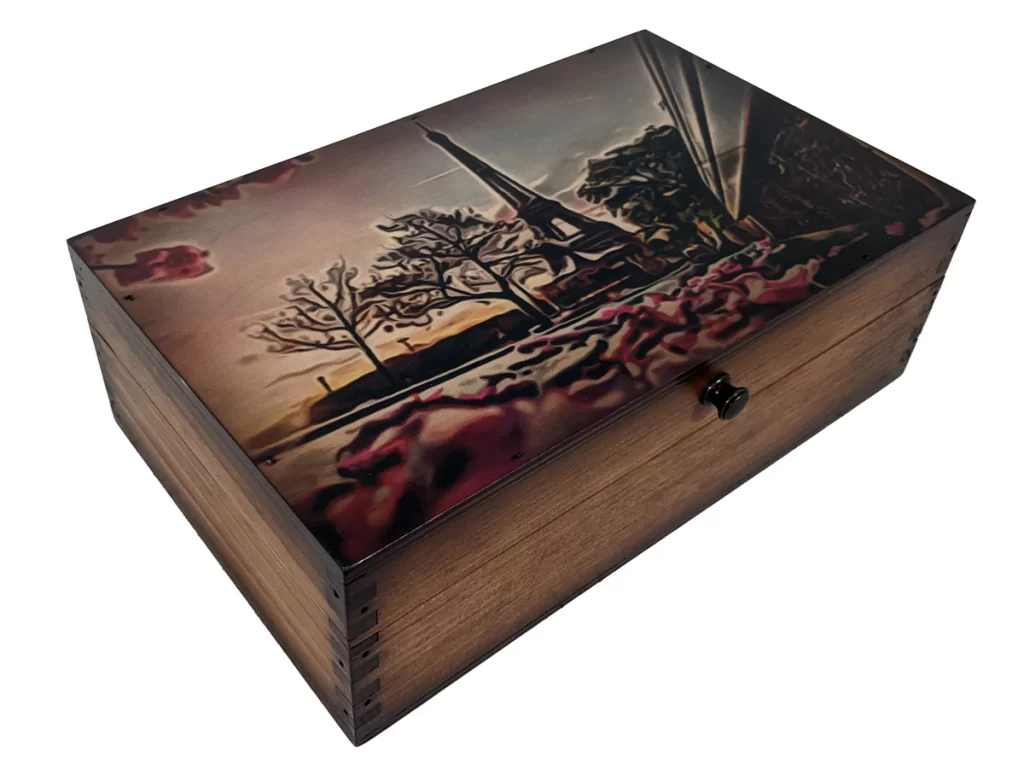 Beautiful antiqued artwork is embedded into the wood then lacquered over top to ensure it resists damage from scratches. We believe our Eiffel Tower Painting medium wood box is a testament to America’s great history of producing quality products that are meant to last . . . and that is how we still do it today!