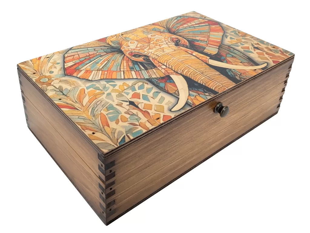 Beautiful stained glass style mosiac artwork is embedded into the wood then lacquered over top to ensure it resists damage from scratches. We believe our Elephant Mosiac medium wood box is a testament to America’s great history of producing quality products that are meant to last . . . and that is how we still do it today!