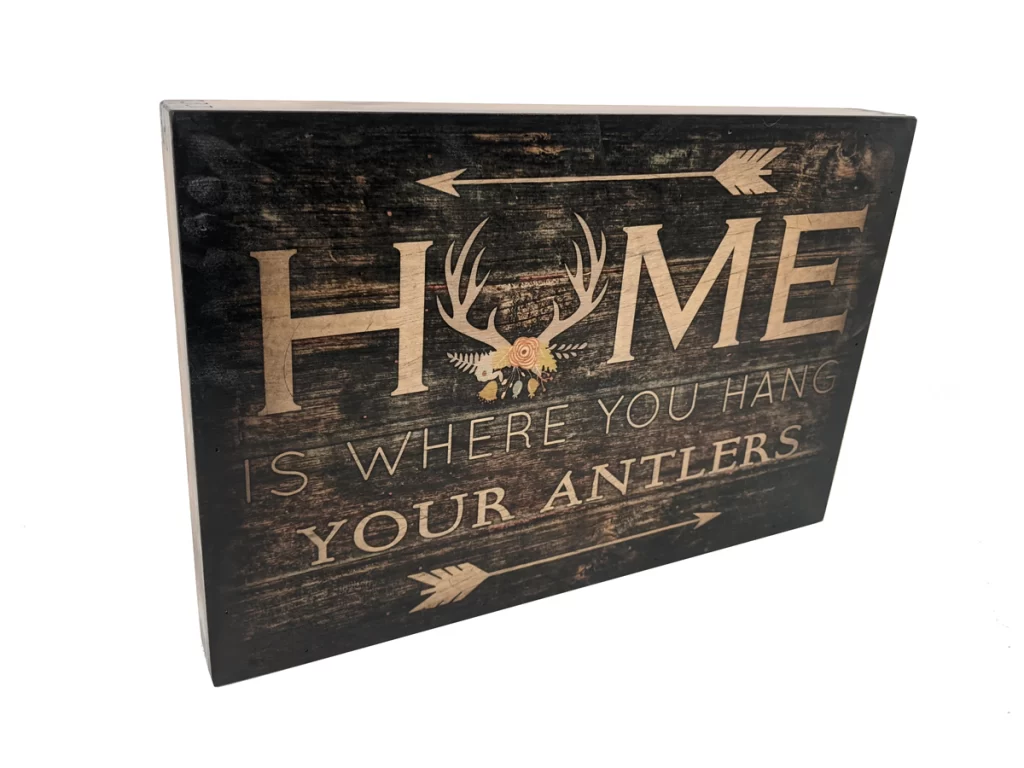 The Elk Hunter Female Antler Wall Art makes the perfect gift for for the woman who loves to hunt. Personalize it with the available addition of rustic hardware on the corners. Accented by our signature box joint frame that is approximately 2″ deep. You can easily hang it or use it as free standing art in your home or office. Each Elk Hunter Female Antler Wall Art is Handcrafted with Pride in the USA.