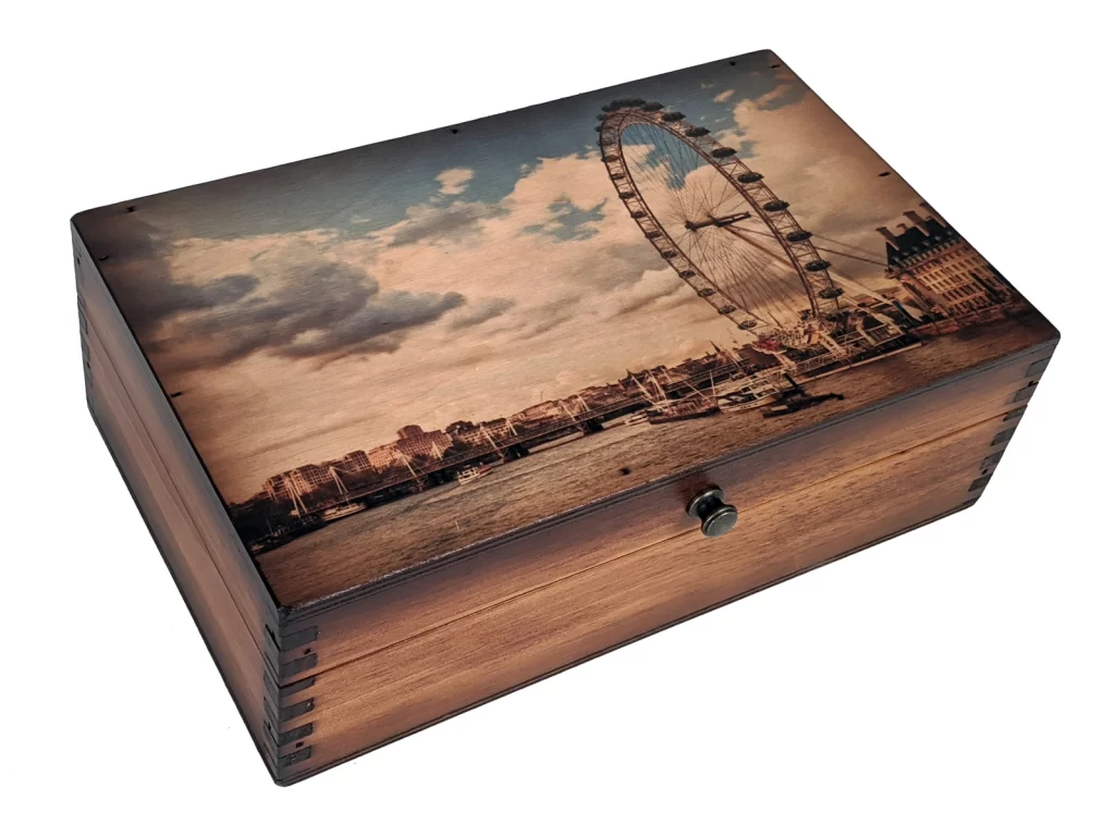 Beautiful antiqued artwork is embedded into the wood then lacquered over top to ensure it resists damage from scratches. We believe our Ferris Wheel in Paris medium wood box is a testament to America’s great history of producing quality products that are meant to last . . . and that is how we still do it today!