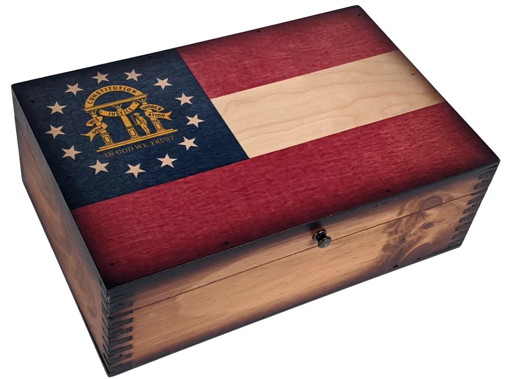 The Georgia State Flag is embedded into the wood then lacquered over top to ensure it resists damage from scratches. We believe our state flag wooden memory boxes are a testament to America’s great history of producing quality products that are meant to last . . . at that is how we still do it today!