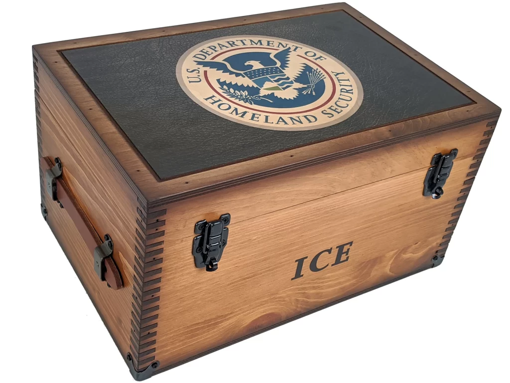 Relic Wood offers this handmade unique ICE-Homeland Security Keepsake Box. This wooden ICE-Homeland Security Keepsake Box makes the perfect gift for our Immigration and Customs Enforcement agents. This box features the ICE-US Department of Homeland Security seal with a black leather background. Accented with decorative metal hardware and leather handles and a plain tray. This ICE-US Department of Homeland Security Keepsake Box is handcrafted in the USA and provides storage for career memorabilia. Personalize it with an engraved brass nameplate up to 75 characters.