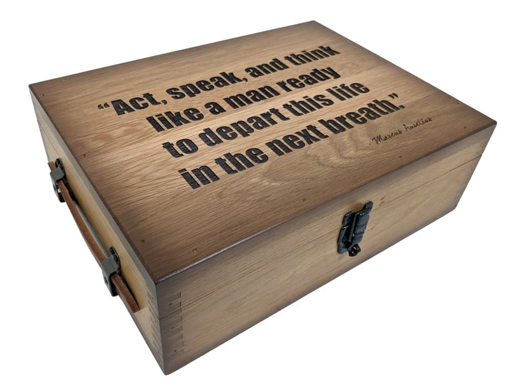When you go to pick this stoic box up . . . it will surprise you with it’s heavy weight, while impressing you with it’s sturdy metal hardware, real leather handles, and lockable hasp on the front. Every single one of these limited edition boxes are sealed, sanded, shaded, and lacquered to perfection during our finishing process.