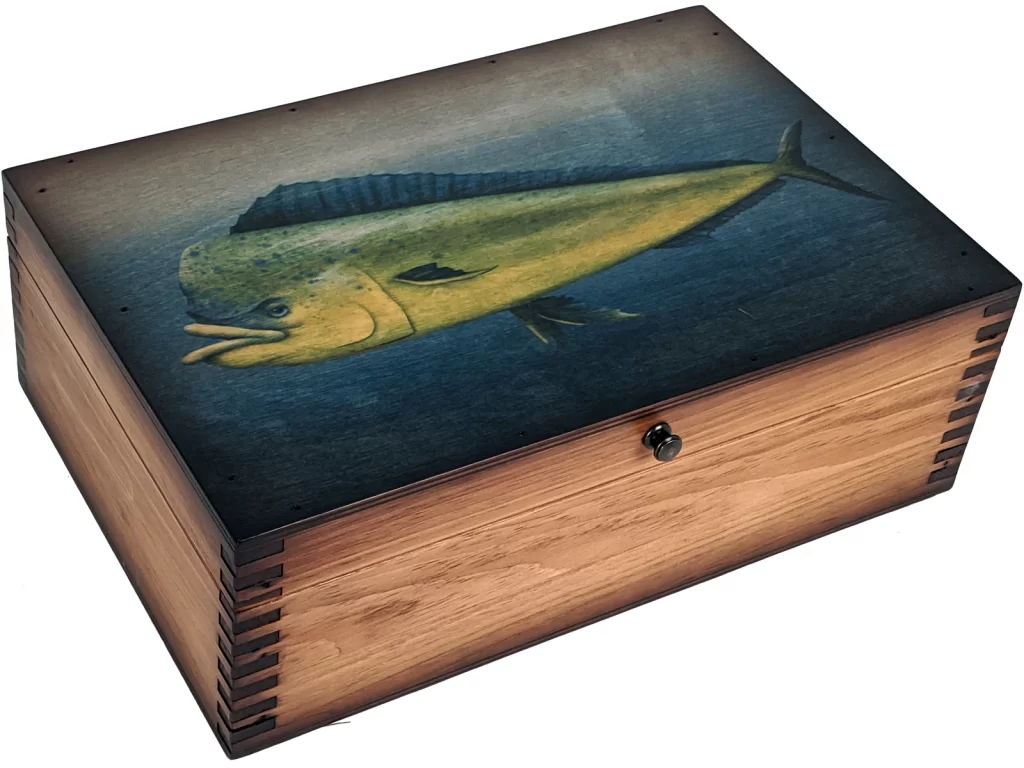 Beautiful antiqued artwork is embedded into the wood then lacquered over top to ensure it resists damage from scratches. We believe our Mahi Mahi memory box is a testament to America’s great history of producing quality products that are meant to last . . . and that is how we still do it today!