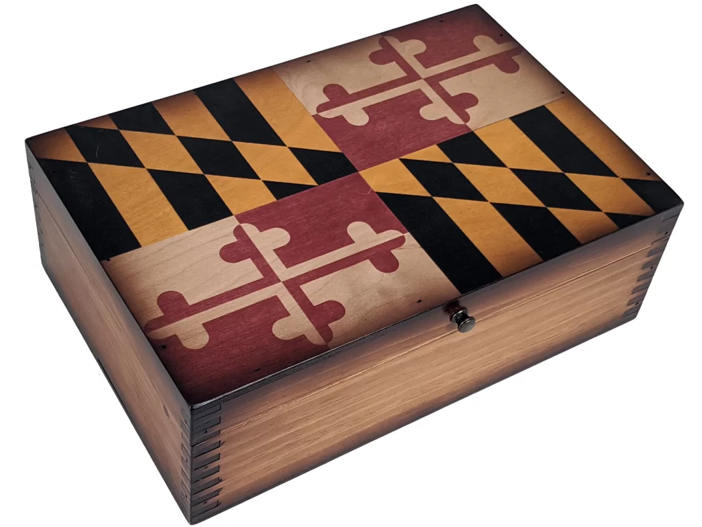 The Maryland State Flag is embedded into the wood then lacquered over top to ensure it resists damage from scratches. We believe our state flag wooden memory boxes are a testament to America’s great history of producing quality products that are meant to last . . . at that is how we still do it today!