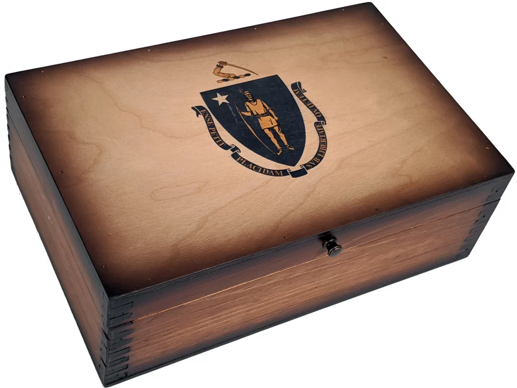 The Massachusetts State Flag is embedded into the wood then lacquered over top to ensure it resists damage from scratches. We believe our state flag wooden memory boxes are a testament to America’s great history of producing quality products that are meant to last . . . at that is how we still do it today!