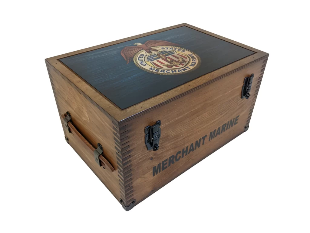 With the Merchant Marine seal on the lid top and Merchant Marine printed across the front of this keepsake, it’s the perfect gift for a Merchant Marine Veteran or active service person.