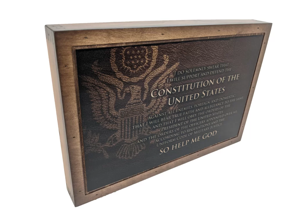 Military Oath of Enlistment Wall Art makes the perfect gift for any Military Veteran. Each one is Handcrafted with Pride in the USA. Accented by our signature box joint frame that is approximately 2″ deep. You can also use it as free-standing art in your home or office.