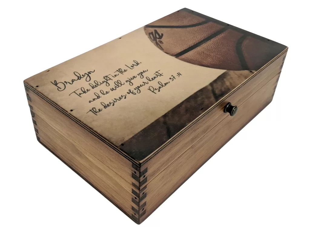 Want to know what the best basketball team gifts are this year? Take a look at our unique basketball player gift boxes. Personalize this vintage wooden box with your high school basketball, middle school basketball, or recreation basketball team photos. You can also put individual action sports photos and include the basketball players name and number on the box. These images are embedded into the wood then sanded, stained, and lacquered over top to resist scratches and ensure longevity. These personalized basketball gifts are a great way to commemorate the glory days for everyone who has played organized basketball. Get an optional brass name plate to create a truly unique basketball team gift that is hand made in the USA just for you.