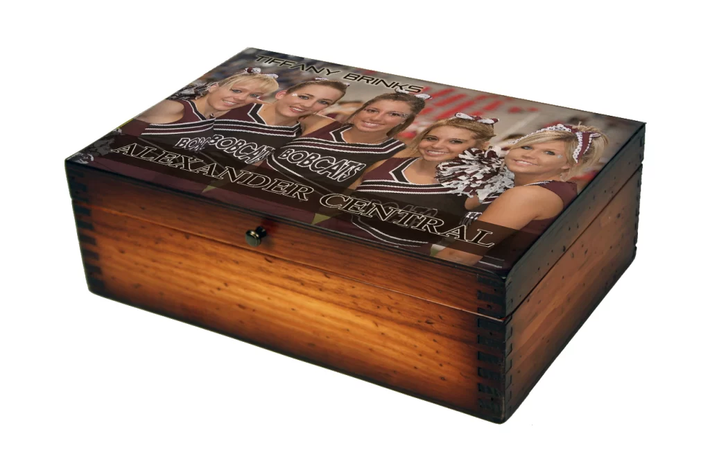 Want to know what the best cheerleader gifts are this year? Take a look at our unique cheerleader gift boxes. Personalize this vintage wooden box with your high school cheerleader, middle school cheerleader, or cheerleading team photos. You can also put individual action sports photos and include the cheerleaders name on the box. These images are embedded into the wood then sanded, stained, and lacquered over top to resist scratches and ensure longevity. These personalized cheerleader gifts are a great way to commemorate the glory days for everyone who has a love for cheering. Get an optional brass name plate to create a truly unique cheerleader gift that is hand made in the USA just for you.