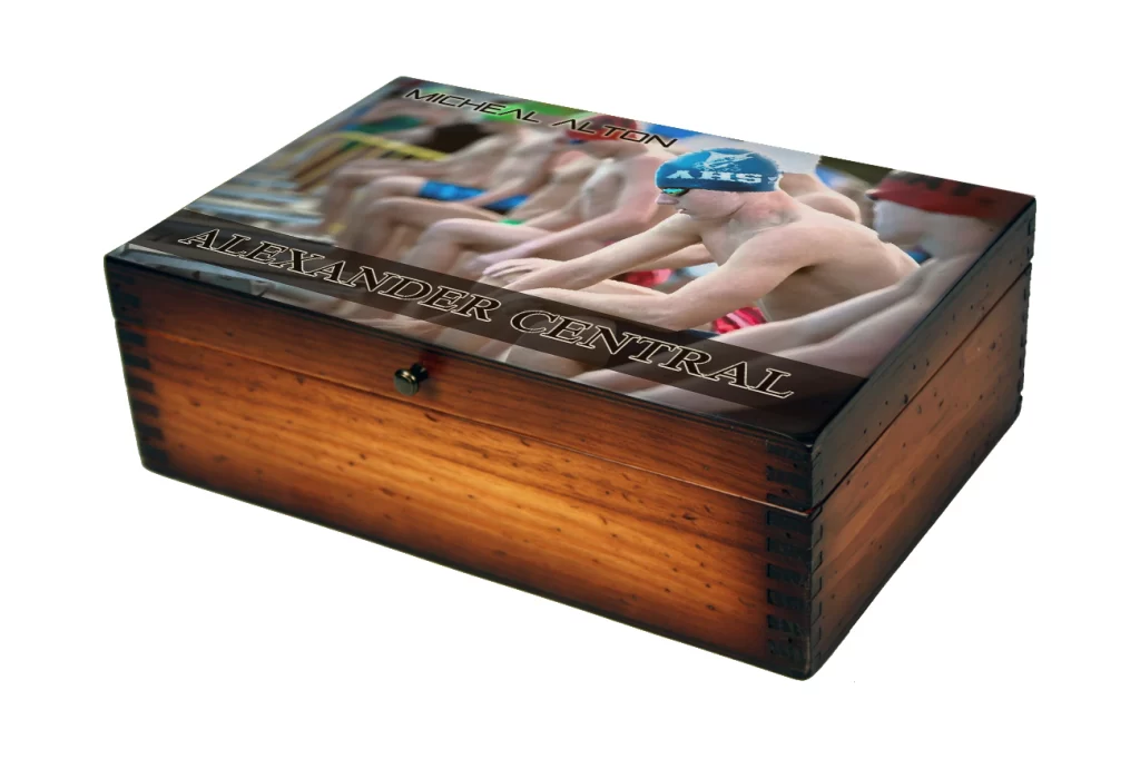 Want to know what the best swim team gifts are this year? Take a look at our unique swim team gift boxes. Personalize this vintage wooden box with your high school swim team, middle school swim team, or individual swimmer photos. You can also put individual action sports photos and include the swimmer’s name on the box. These images are embedded into the wood then sanded, stained, and lacquered over top to resist scratches and ensure longevity. These personalized swim team gifts are a great way to commemorate the glory days for everyone who has been on a swim team. Get an optional brass name plate to create a truly unique swim team gift that is hand made in the USA just for you.