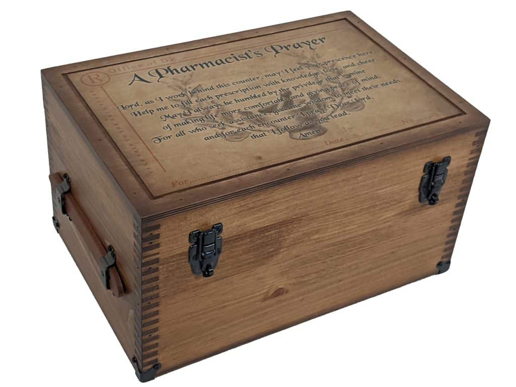 Features lid top artwork with a prescription pad background and Pharmacist’s prayer. It’s the perfect place to store their favorite belongings.