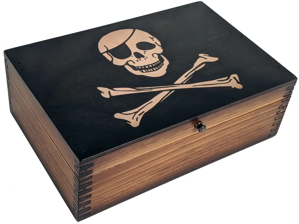 Beautiful antiqued artwork is embedded into the wood and then lacquered over top to ensure it resists damage from scratches. We believe our pirate flag wooden memory box is a testament to America’s great history of producing quality products that are meant to last.