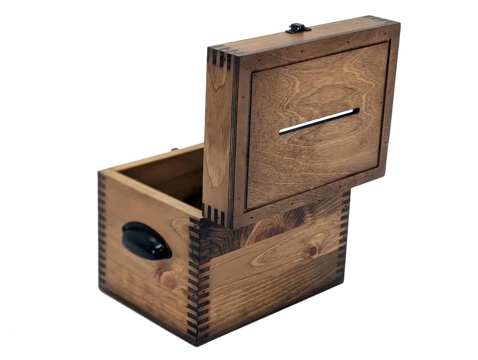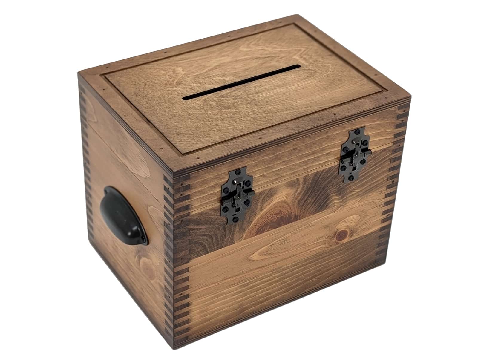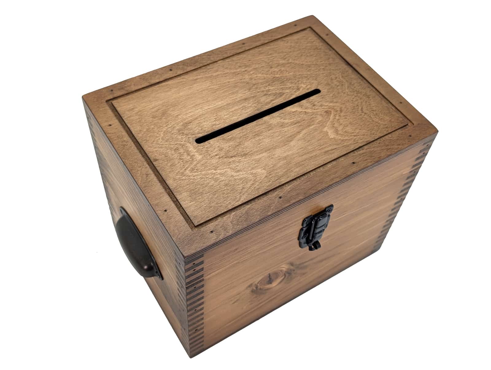 Our Plain Card Box is the perfect place for wedding guests to deposit wedding cards. Also, this box can make it easy to take up donations for a good cause. Our Plain Card Box is accented with a lockable metal hasp, decorative metal handles, and a routed lid top.