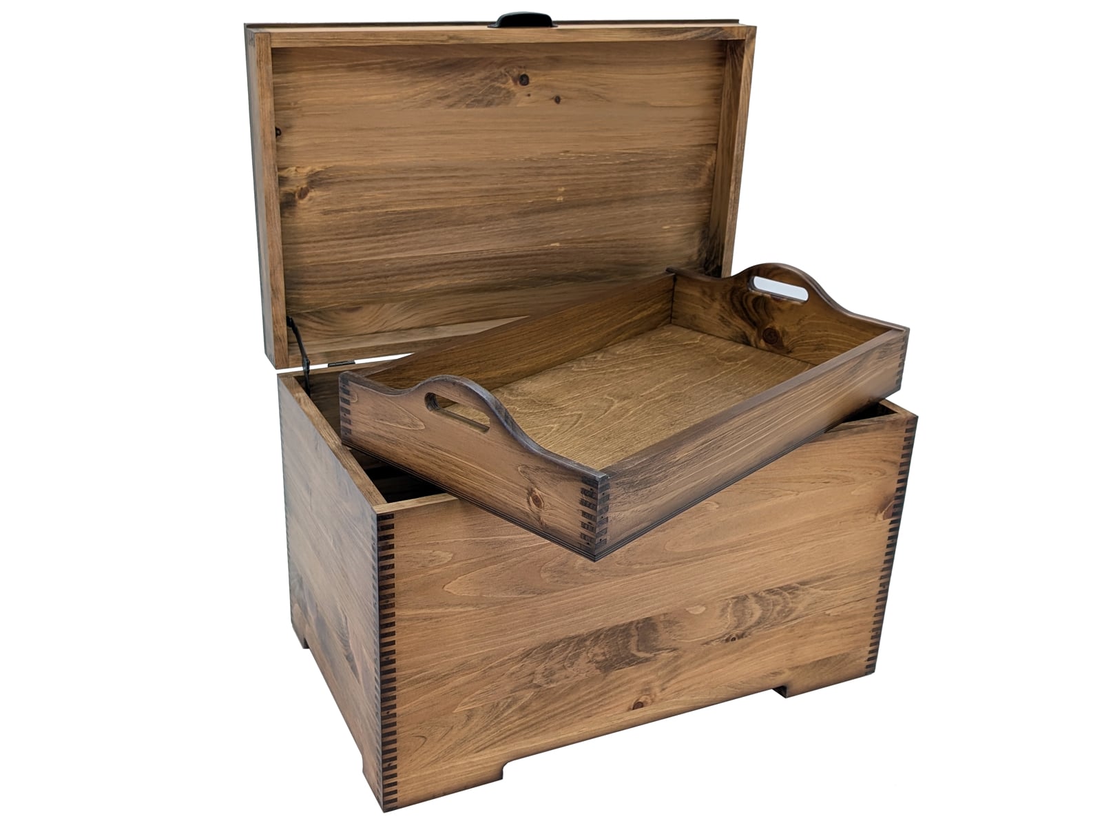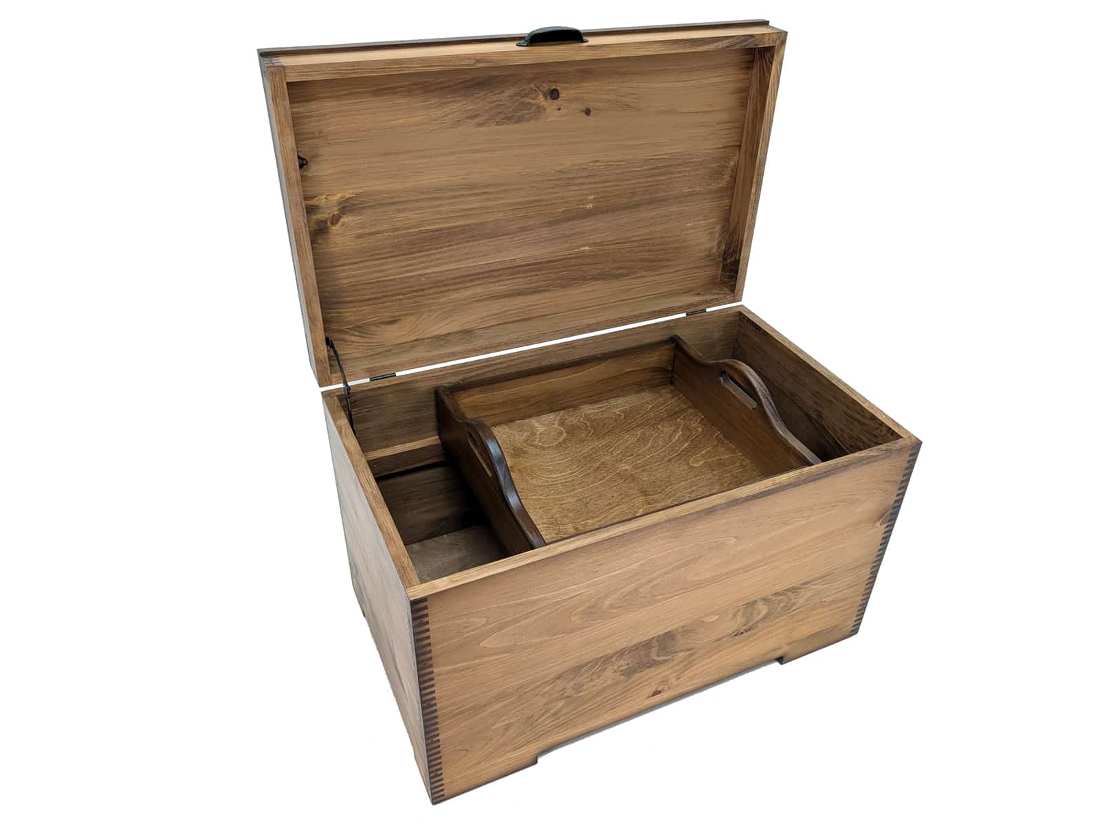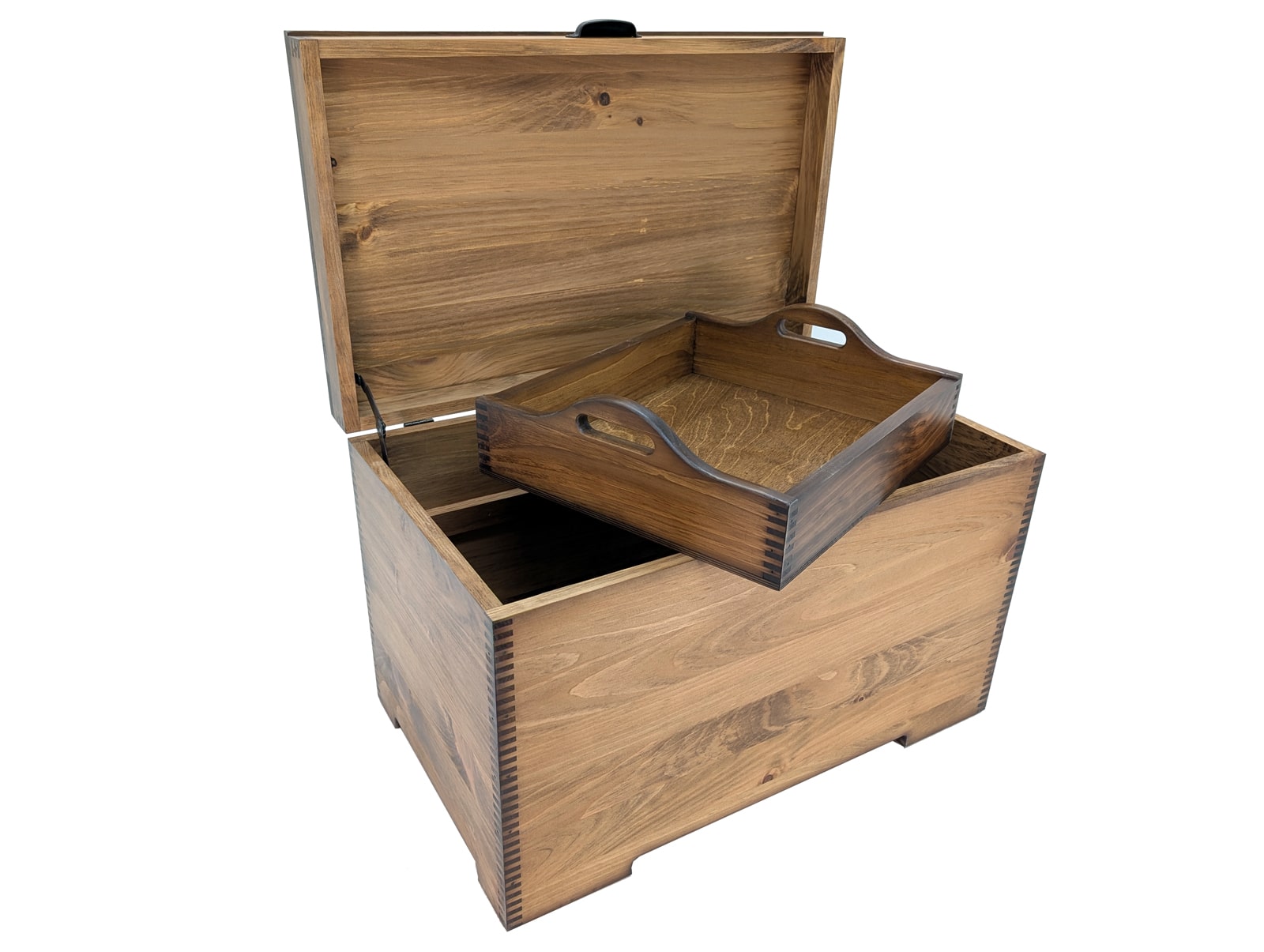 Our Plain Wooden Trunk is an heirloom gift to pass down throughout generations. It comes standard with the hardware as shown. Therefore, you will treasure this Plain Wooden Trunk for a lifetime. Add an Inside Tray to your trunk. You can choose either a full length tray, or go with the half length sliding tray . Felt can also be added to the bottom of it. Your color choices include red, burgundy, royal blue, navy blue, olive green, and black. Lastly, you can add your choice of felt on the Inside Lid, a brass nameplate, or a brass plaque.