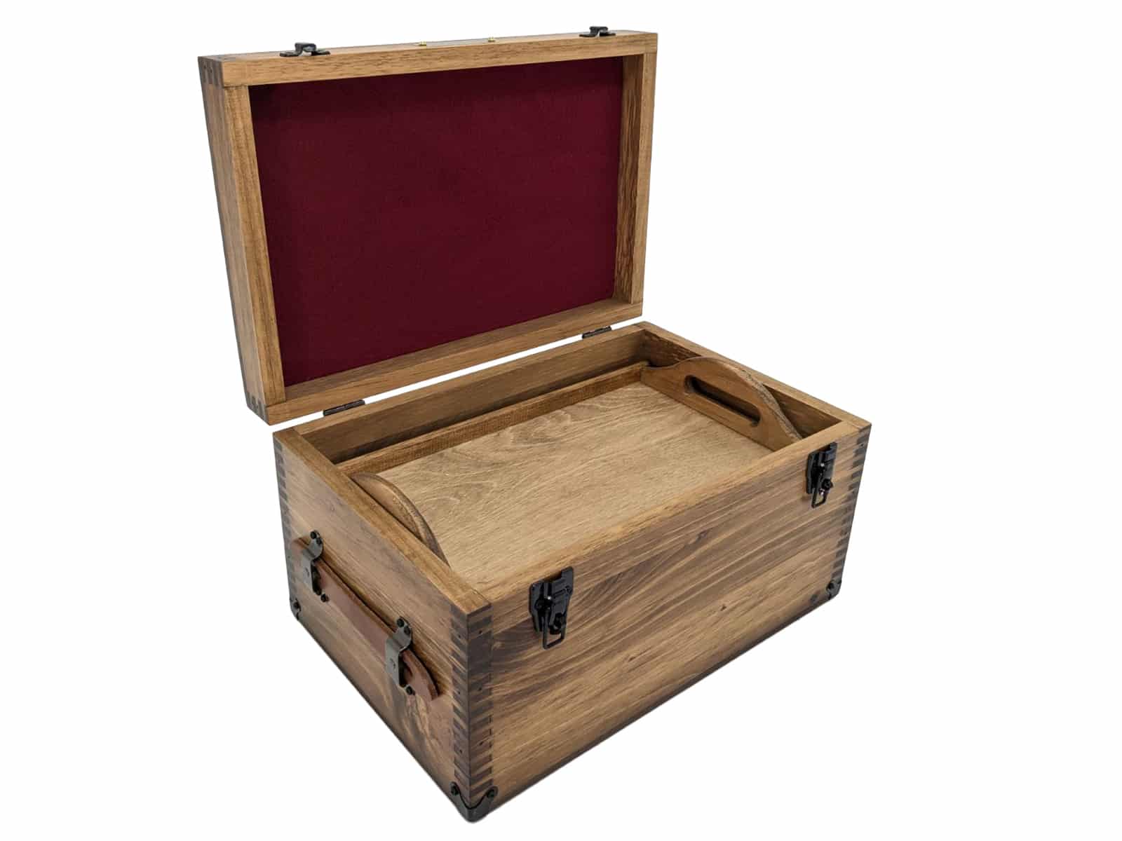 INCLUDES: Removeable Tray, Brass Nameplate, Burgundy Felt Shadowbox Inside Lid