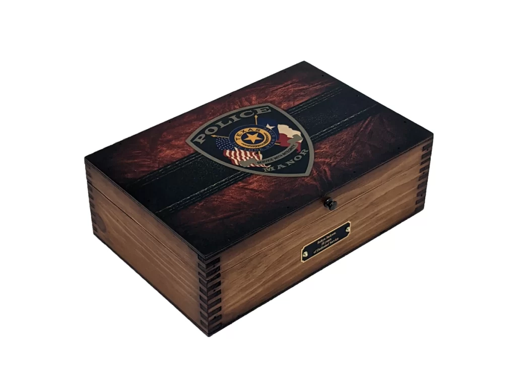 The memory box begins with your state trooper badge or patch artwork prominently featured on the lid—instantly reflecting your affiliation and service identity. From there, personalization options expand: laser-engraved names, ranks, dates of service, a brass nameplate on the front panel, and your choice of felt-lined interior in a rich color of your preference. Inside, the space is sized to store medals, patches, letters, photos, and other important items, making it ideal for commemorating deployment, retirement, or a significant milestone in a trooper’s career.