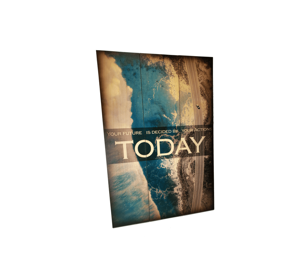 Our Today 3 Panel Pallet Sign makes an amazing statement piece. Boldly stating a profound truth that few will fully accept, but will always remain true nevertheless. “Your Future Is Decided By Your Actions Today”. This wall art is perfect for decorating any high school or college dorm room, new home office, or Corporate HQ to keep everyone who reads it motivated. This Today 3 Panel Pallet Sign makes a great gift for college students, or the perfect motivational décor for anywhere you need people to seize the moment!