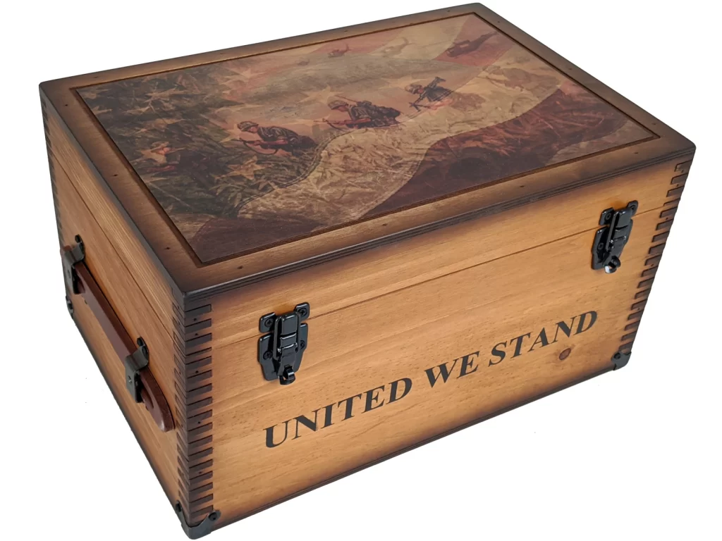The United We Stand keepsake box is a great gift for storing military memorabilia, travel documents, photographs, and books. It is the perfect gift for family and friends who appreciate the service and sacrifice our Veterans make for us! This product is handcrafted in the U.S.A.