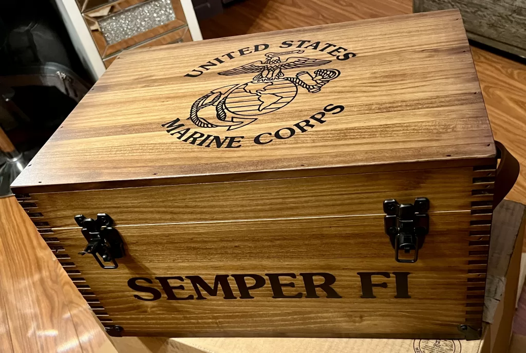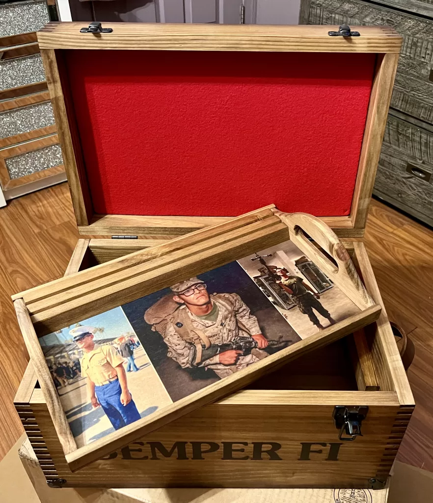 I couldn’t be happier with my custom USMC wooden footlocker. The attention to detail is incredible, from the precision in the engraving to the quality of the materials used. It’s sturdy, beautifully crafted, and a perfect way to honor my son’s service in the Corps. The personalization options made it truly unique, Madeline was amazing in helping me choose which pictures to use for my custom tray, and it exceeded all my expectations. This is more than just a footlocker—it’s a piece of art that holds a lot of sentimental value. Highly recommend to anyone looking for something durable and meaningful!