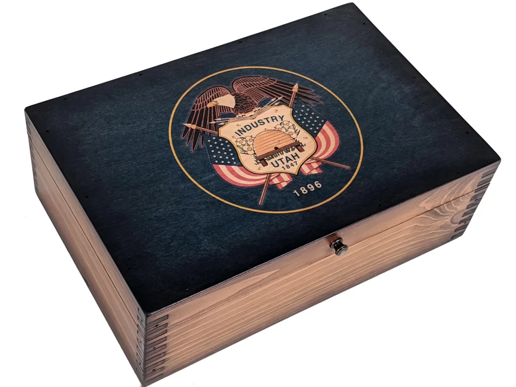 The Utah State Flag is embedded into the wood then lacquered over the top to ensure it resists damage from scratches. We believe our state flag wooden memory boxes are a testament to America’s great history of producing quality products that are meant to last . . . at that is how we still do it today!