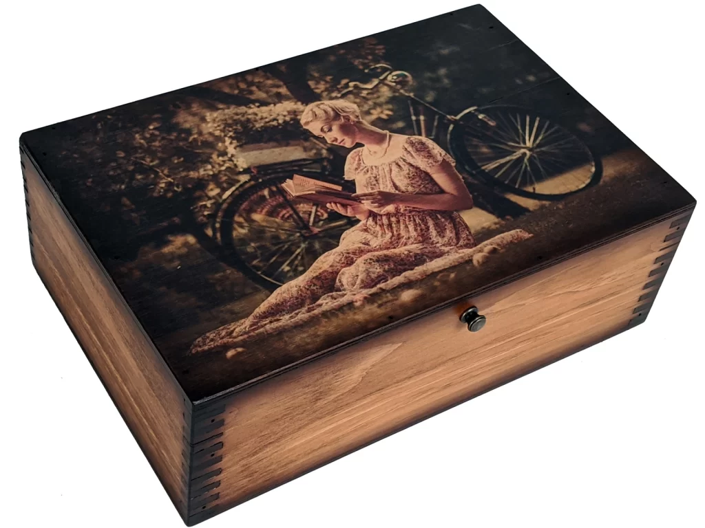 This vintage reading in spring memory box can be used to stow away keepsakes. We hand build wooden boxes that we hope will never clutter our landfills, by making boxes to last, that can be passed down through generations.