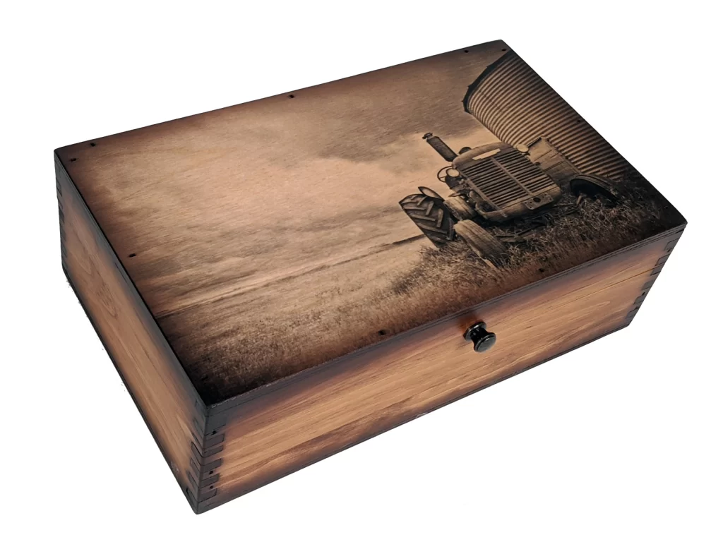 Beautiful antiqued artwork is embedded into the wood then lacquered over top to ensure it resists damage from scratches. We believe our Vintage Tractor medium wood box is a testament to America’s great history of producing quality products that are meant to last . . . and that is how we still do it today!