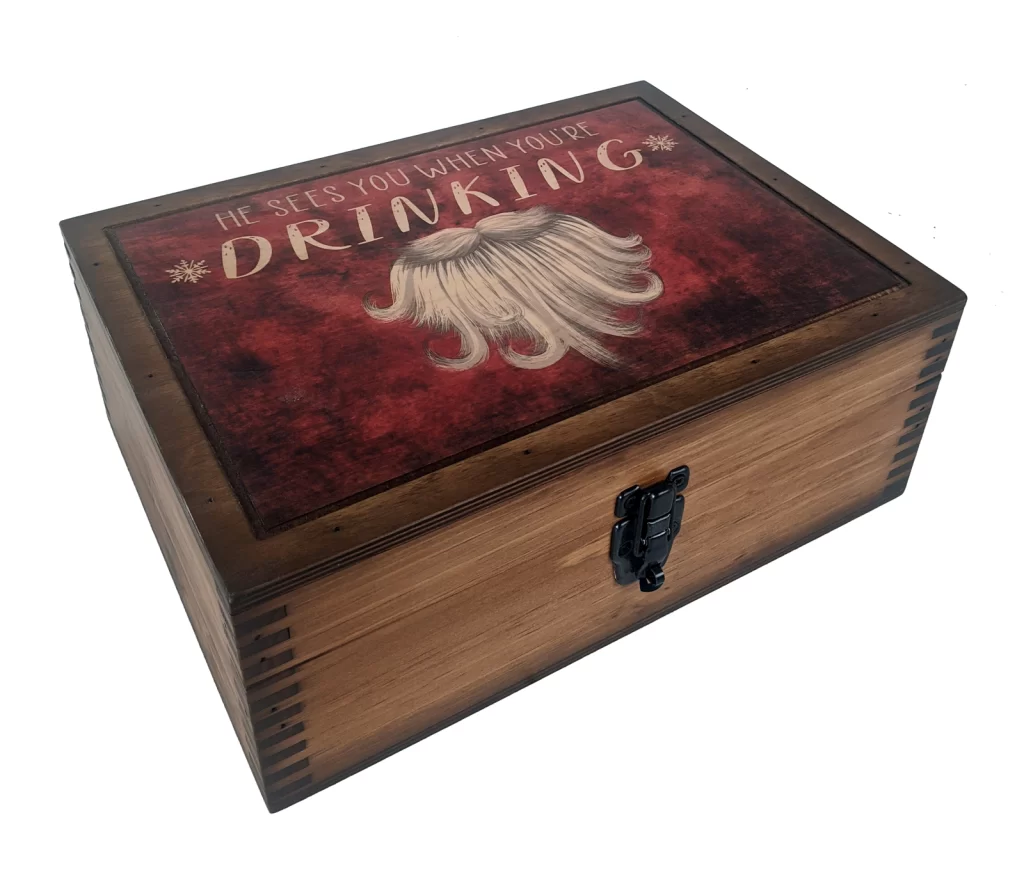 “He sees you when you’re drinking…” When You’re Drinking Alcohol Box is inspired by the well known Christmas Song ‘Santa is Coming to Town’.  We decided to add a little holiday spirit to our In Stock Alcohol gift set selection. We handcraft the best alcohol gift set just for you when you place your order at Relic Wood creating a truly unique, one-of-a-kind alcohol gift to present to anyone you want to impress. This alcohol gift set lets you personalize it with a brass nameplate option.