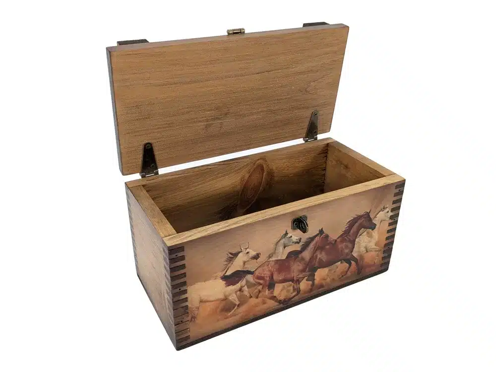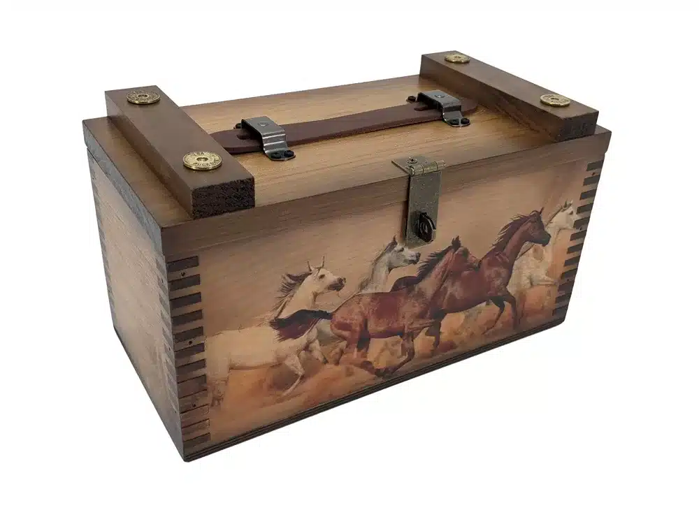 Rustic decor or functional shooter’s box. This handcrafted wooden box makes the perfect equestrian gift for horse lovers or wildlife enthusiasts alike.