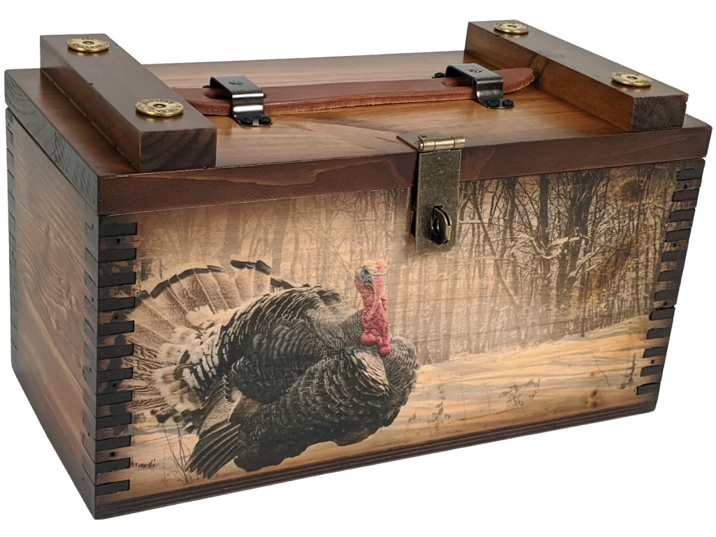Rustic decor or functional shooter’s box. This handcrafted wooden box makes the perfect gift for turkey hunters or wildlife enthusiasts alike.